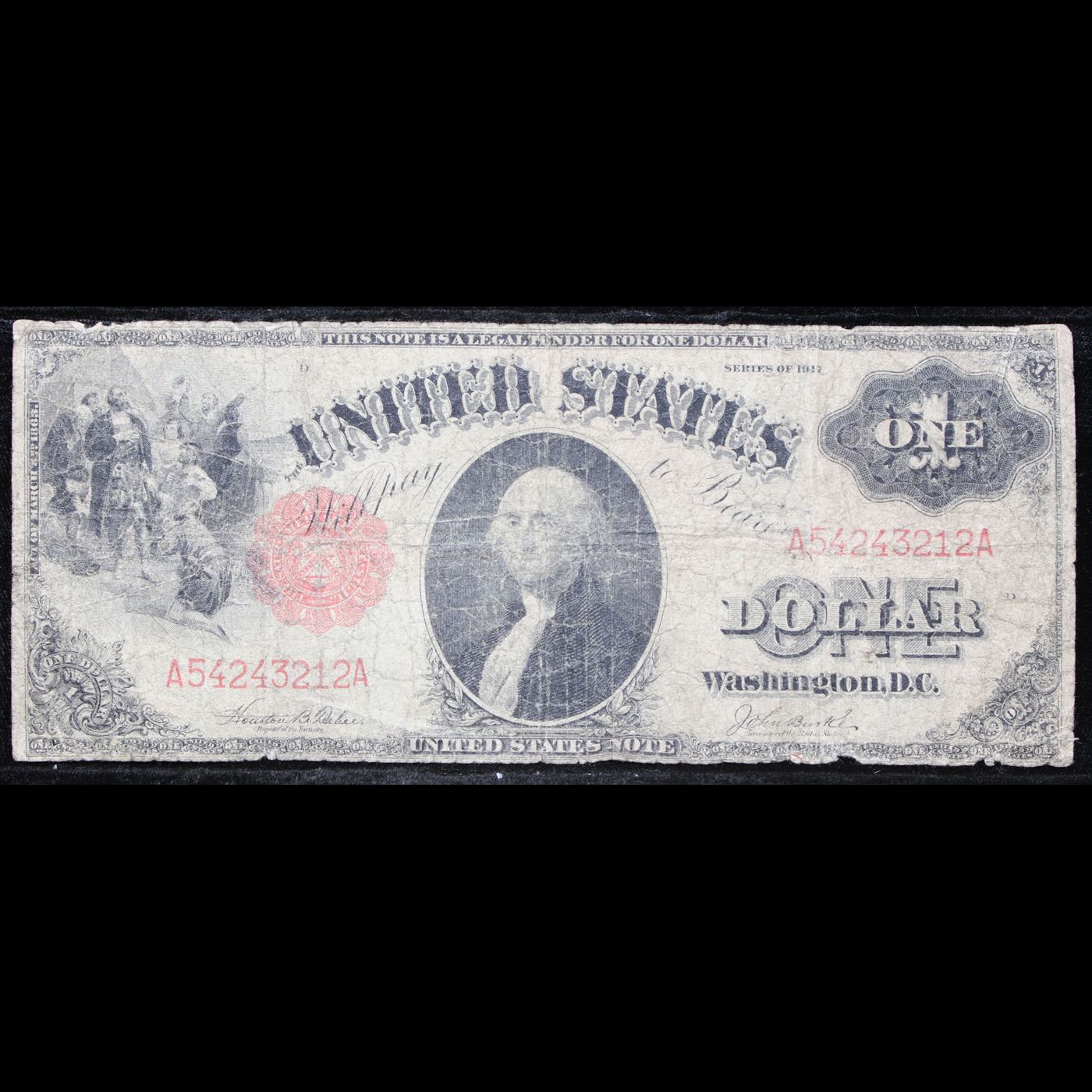 1917 $1 Large Size Legal Tender, Signatures of Burke & Teehee, FR36 Grades f, fine. FR-36 From Series 1917, this popular $1 Legal Tender Note is the final issue in a popular, long-running series! Nicknamed the “Sawhorse” for its intricate back design, which features a large X, this exquisite motif was first printed in the 1870s. Issued for more than half a century, it ended with these Series 1917 notes, which were issued during the tenure of U.S. Treasury officials Hoouston Teehee and John Burke – whose signatures appear on the note’s face. Available now because of a special purchase, these lightly circulated pieces are still crisp and bright with bold color. The face features a portrait of George Washington along with a detailed vignette titled Columbus Discovery of Land. Last issued over 90 years ago. These notes are highly sought after, and demand outpaces availability