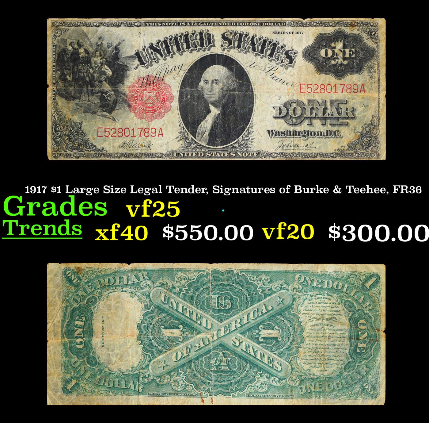 1917 $1 Large Size Legal Tender, Signatures of Burke & Teehee, FR36 Grades vf+. FR-36 From Series 1917, this popular $1 Legal Tender Note is the final issue in a popular, long-running series! Nicknamed the “Sawhorse” for its intricate back design, which features a large X, this exquisite motif was first printed in the 1870s. Issued for more than half a century, it ended with these Series 1917 notes, which were issued during the tenure of U.S. Treasury officials Hoouston Teehee and John Burke – whose signatures appear on the note’s face. Available now because of a special purchase, these lightly circulated pieces are still crisp and bright with bold color. The face features a portrait of George Washington along with a detailed vignette titled Columbus Discovery of Land. Last issued over 90 years ago. These notes are highly sought after, and demand outpaces availability