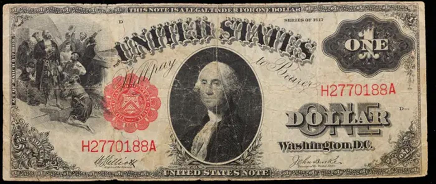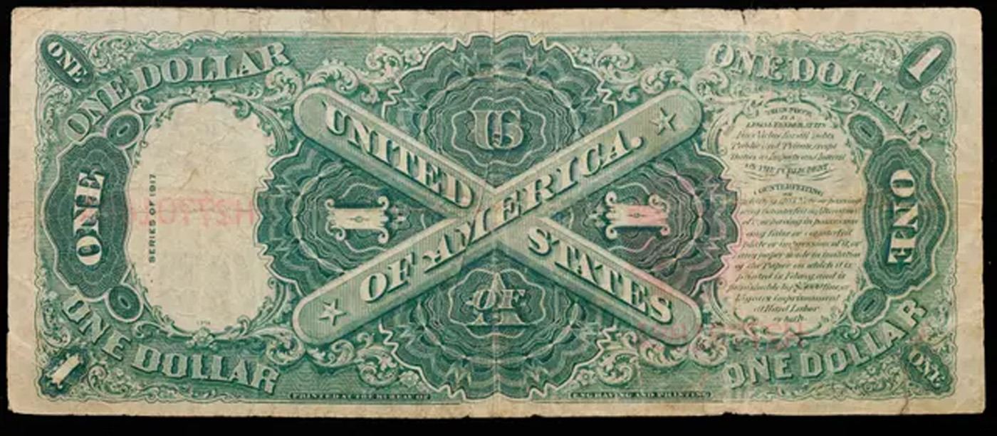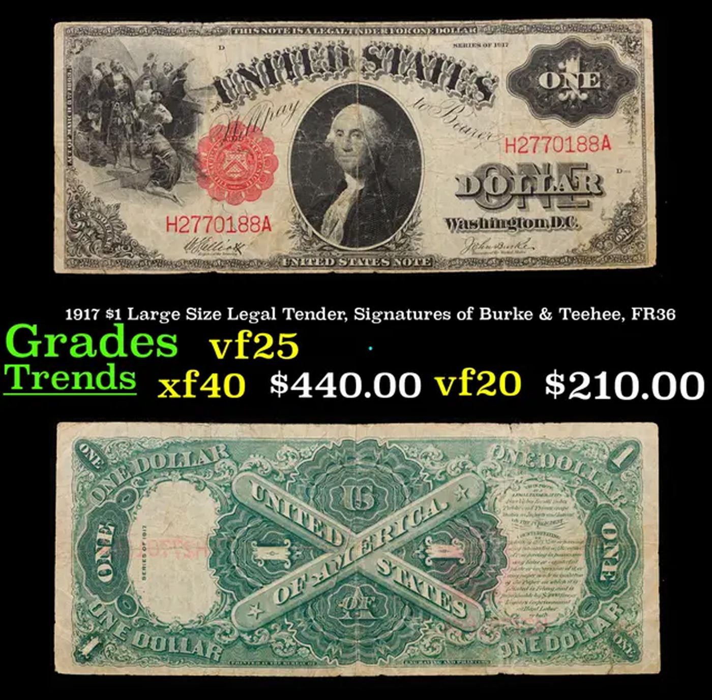 1917 $1 Large Size Legal Tender, Signatures of Burke & Teehee, FR36 Grades vf+. FR-36 From Series 1917, this popular $1 Legal Tender Note is the final issue in a popular, long-running series! Nicknamed the “Sawhorse” for its intricate back design, which features a large X, this exquisite motif was first printed in the 1870s. Issued for more than half a century, it ended with these Series 1917 notes, which were issued during the tenure of U.S. Treasury officials Hoouston Teehee and John Burke – whose signatures appear on the note’s face. Available now because of a special purchase, these lightly circulated pieces are still crisp and bright with bold color. The face features a portrait of George Washington along with a detailed vignette titled Columbus Discovery of Land. Last issued over 90 years ago. These notes are highly sought after, and demand outpaces availability