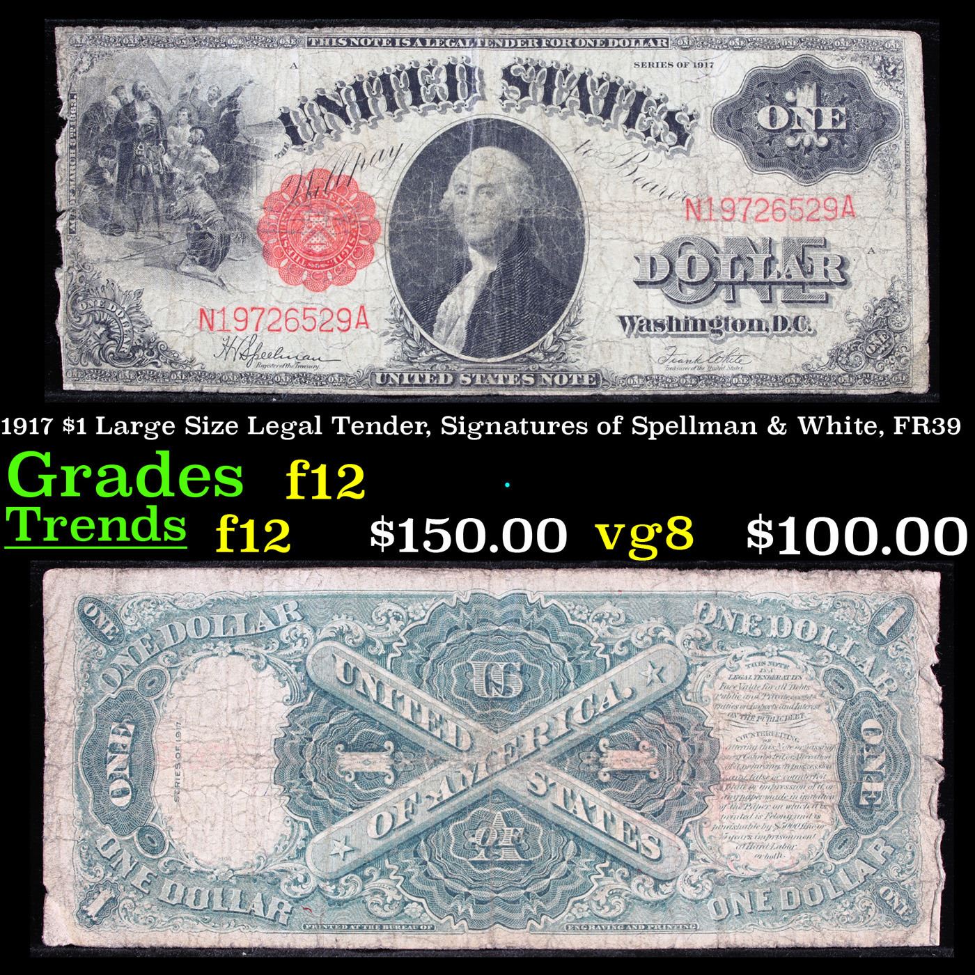 1917 $1 Large Size Legal Tender, Signatures of Spellman & White, FR39 Grades f, fine.