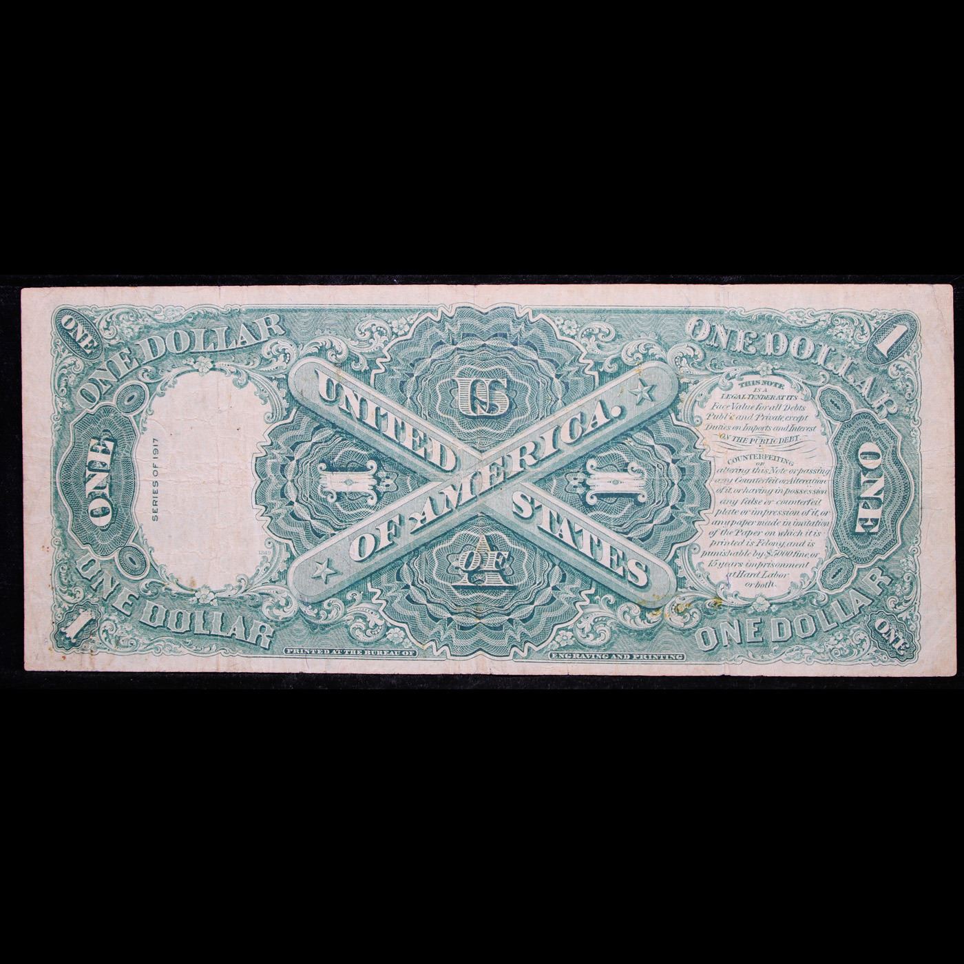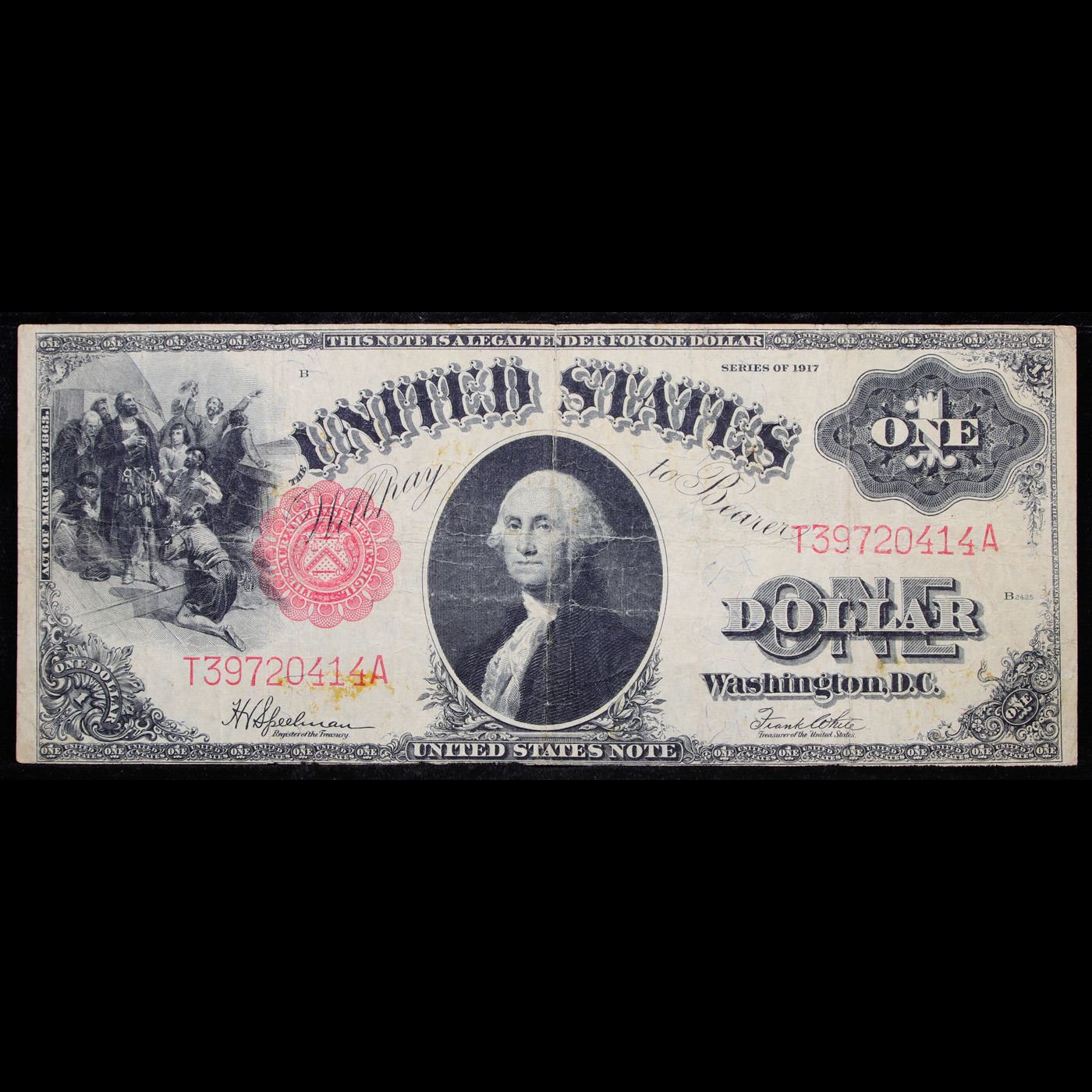 1917 $1 Large Size Legal Tender, Signatures of Spellman & White, FR39 Grades vf+. This 1917 $1 note is the last large-sized legal tender bank note ever issued. It's referred to as a "Horseblanket Note," due to their large size. The obverse features Washington and a vignette of Columbus sighting America. The reverse shows a "sawhorse" design. Add in the bright red seal and serial numbers and you've got a miniature work of art.