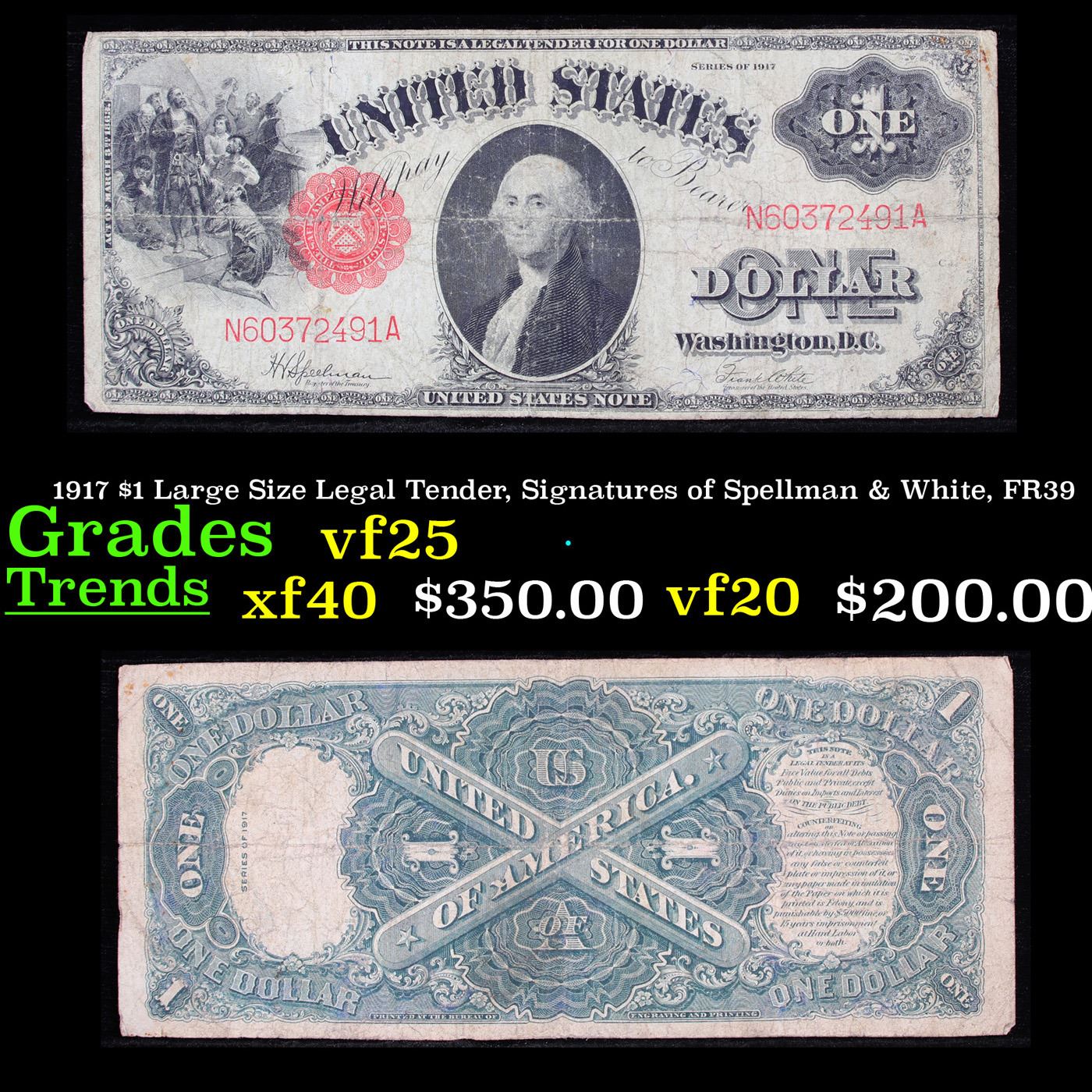 1917 $1 Large Size Legal Tender, Signatures of Spellman & White, FR39 Grades vf+