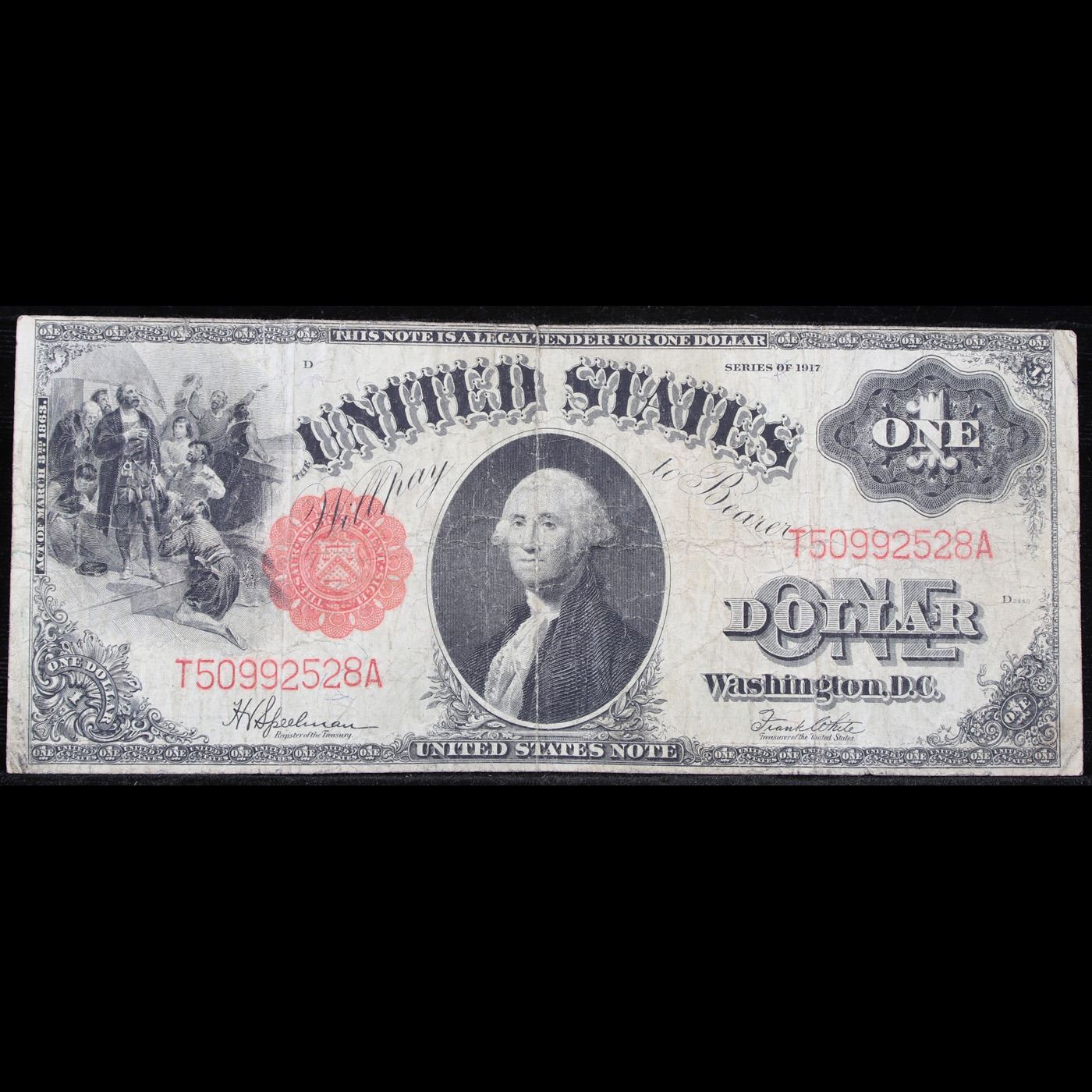 1917 $1 Large Size Legal Tender, Signatures of Spellman & White, FR39 Grades vf+. This 1917 $1 note is the last large-sized legal tender bank note ever issued. It's referred to as a "Horseblanket Note," due to their large size. The obverse features Washington and a vignette of Columbus sighting America. The reverse shows a "sawhorse" design. Add in the bright red seal and serial numbers and you've got a miniature work of art.
