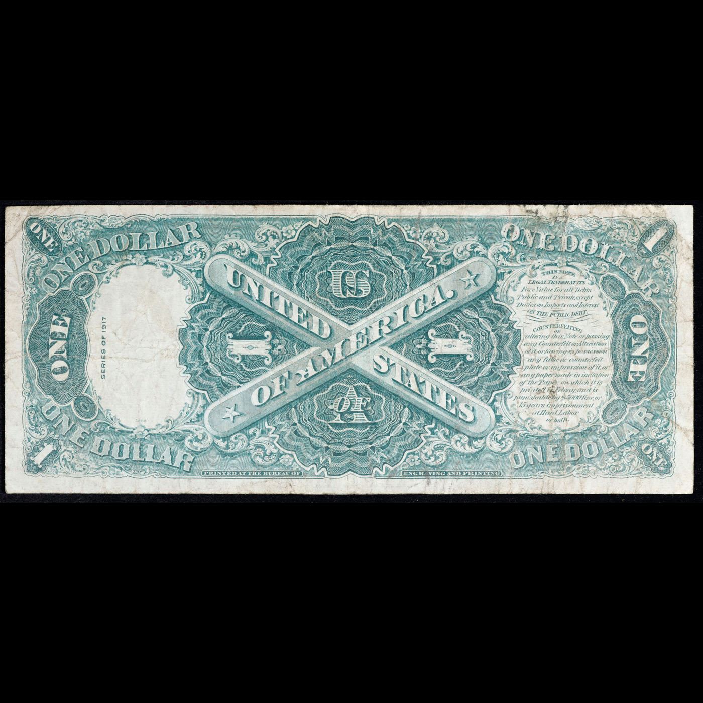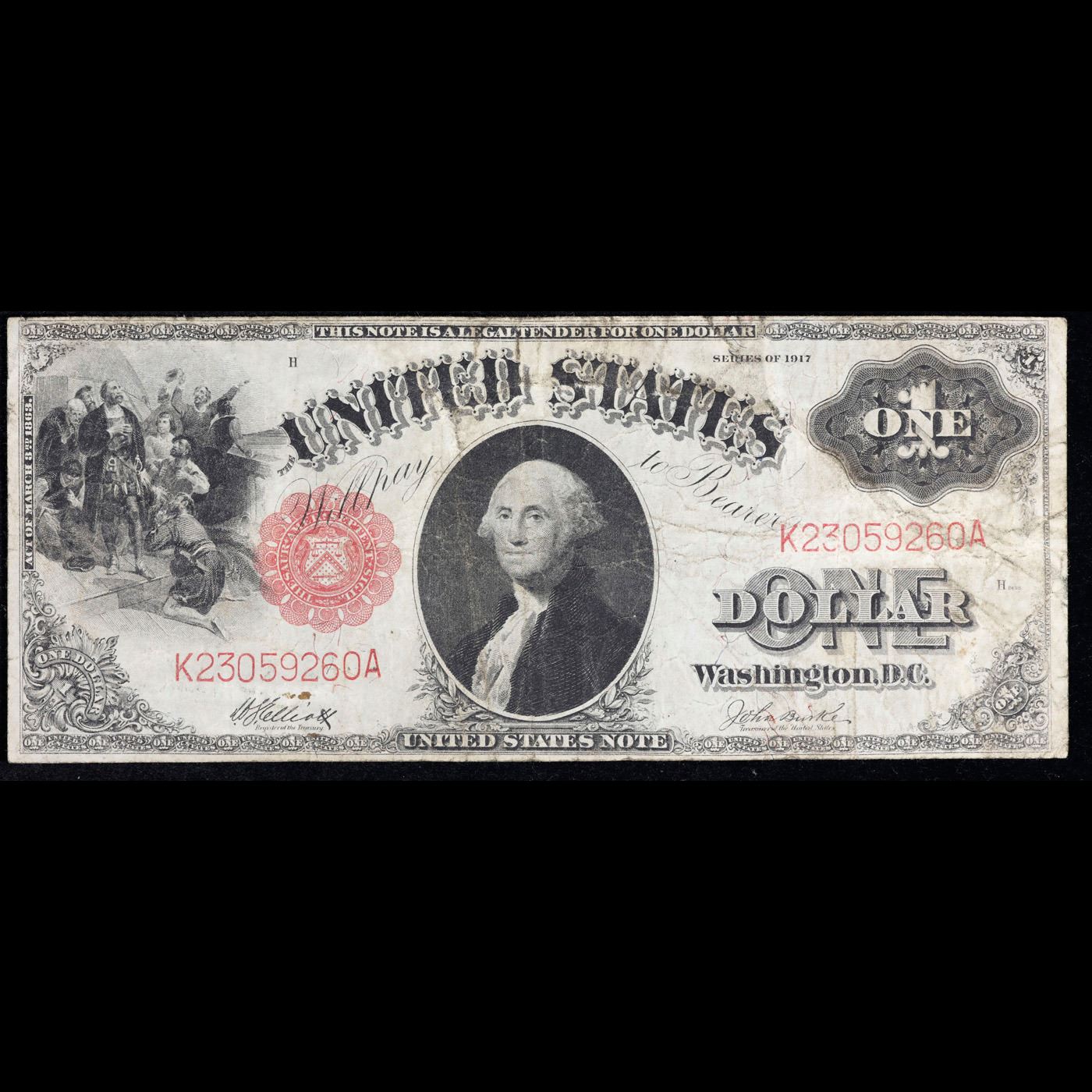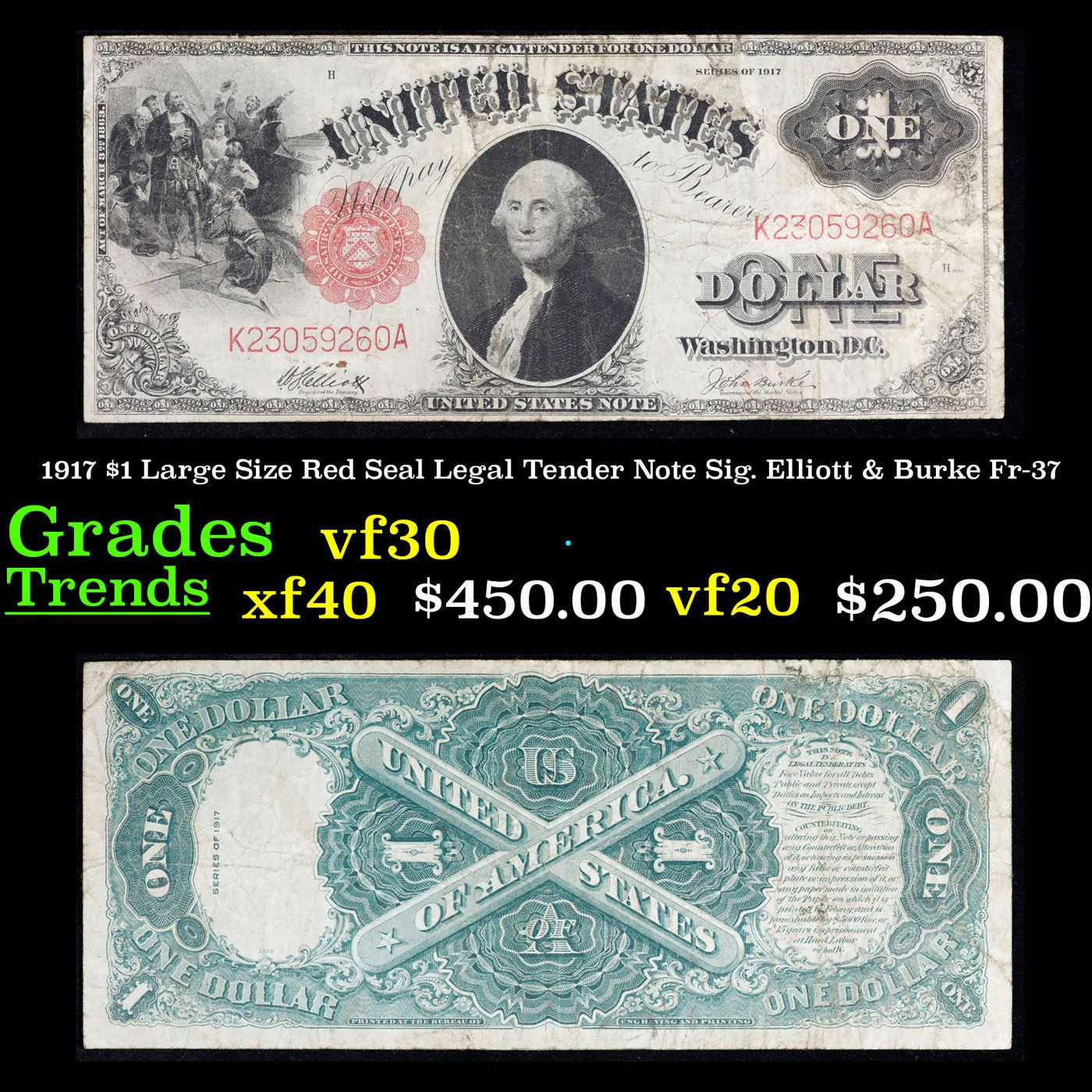 1917 $1 Large Size Red Seal Legal Tender Note Sig. Elliott & Burke Fr-37 Grades vf++. From Series 1917, this popular $1 Legal Tender Note is the final issue in a popular, long-running series! Nicknamed the “Sawhorse” for its intricate back design, which features a large X, this exquisite motif was first printed in the 1870s. Issued for more than half a century, it ended with these Series 1917 notes, which were issued during the tenure of U.S. Treasury officials Hoouston Teehee and John Burke – whose signatures appear on the note’s face. Available now because of a special purchase, these lightly circulated pieces are still crisp and bright with bold color. The face features a portrait of George Washington along with a detailed vignette titled Columbus Discovery of Land. Last issued over 90 years ago. These notes are highly sought after, and demand outpaces availability
