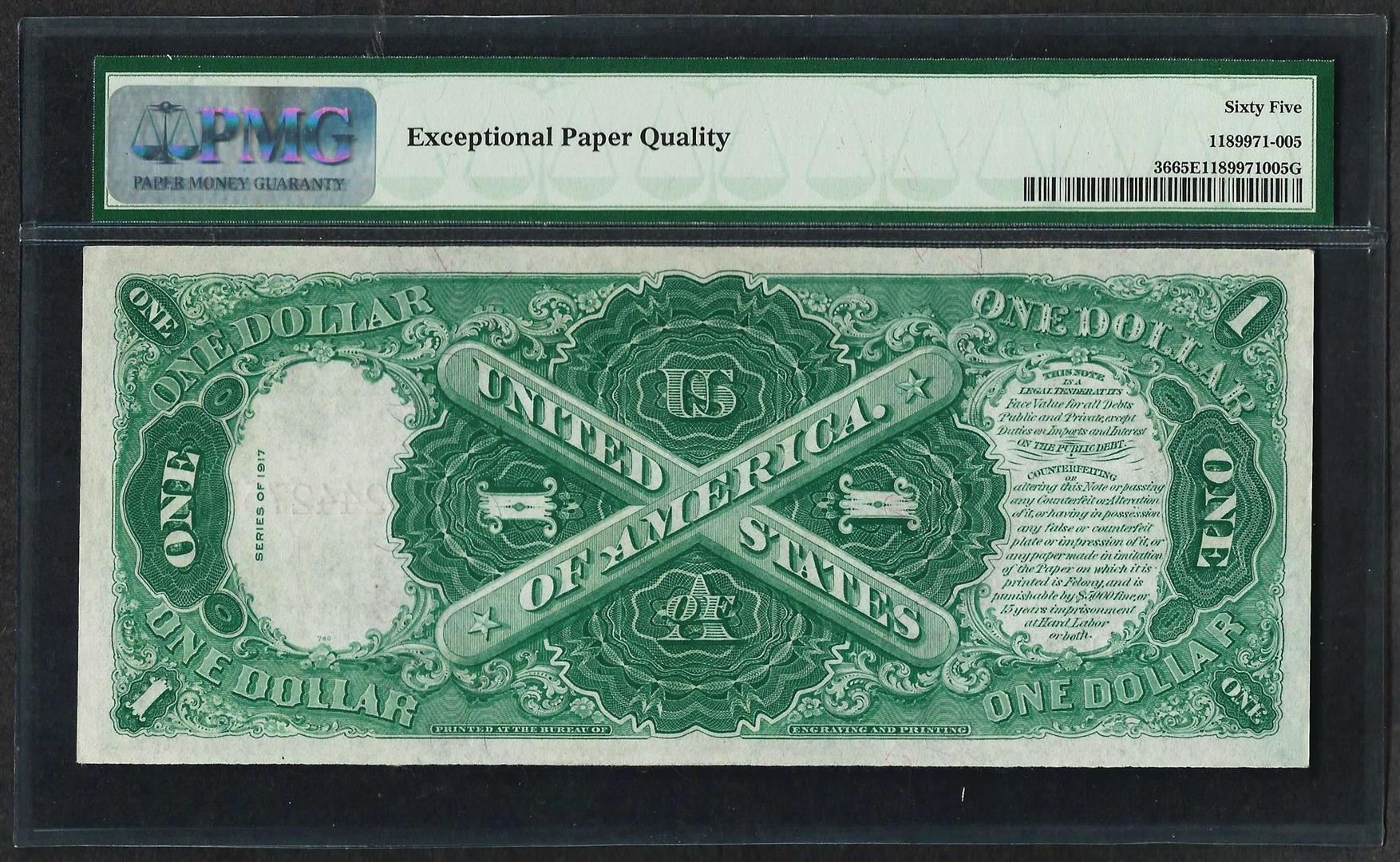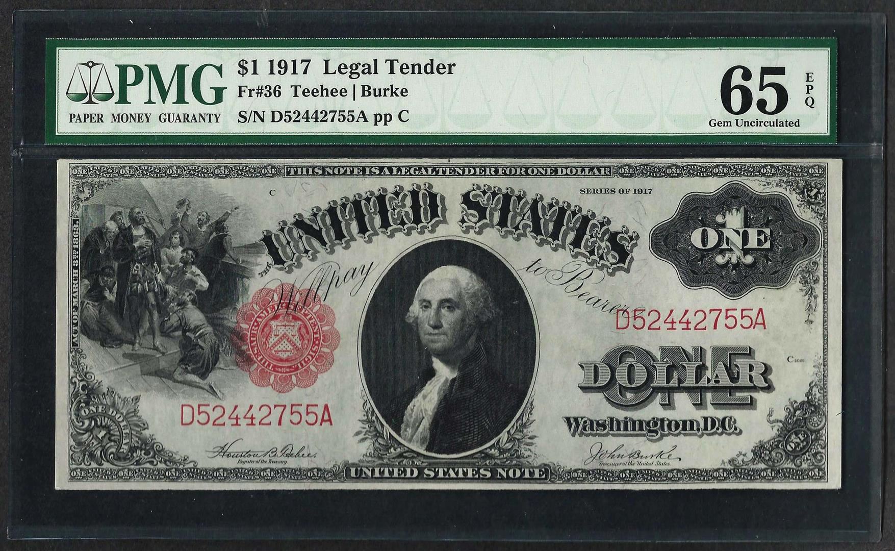 One 1917 $1 Legal Tender Note Fr.36 PMG Gem Uncirculated 65EPQ. PMG Certified.