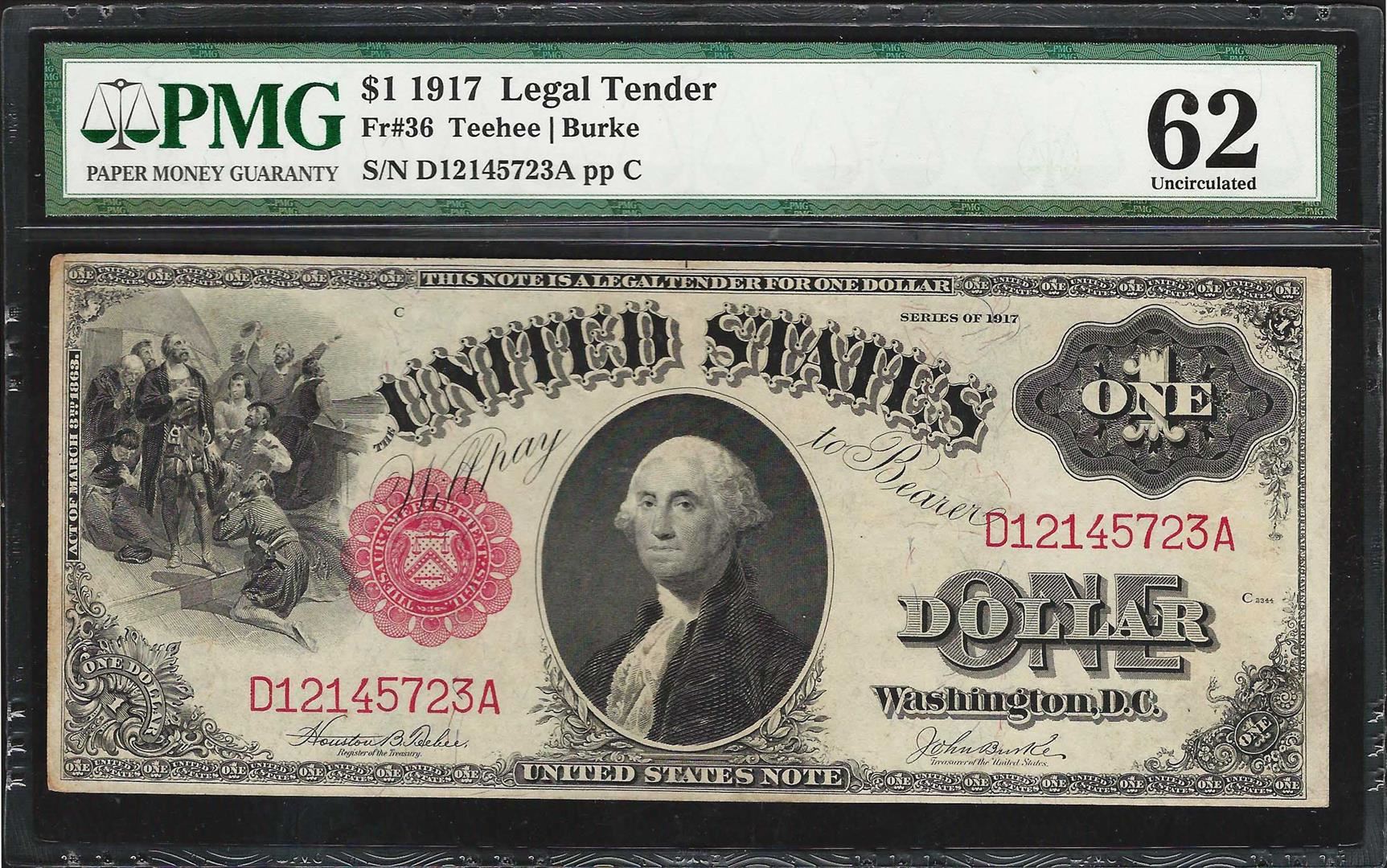 One 1917 $1 Legal Tender Note Fr.36 PMG Uncirculated 62. PMG Certified.