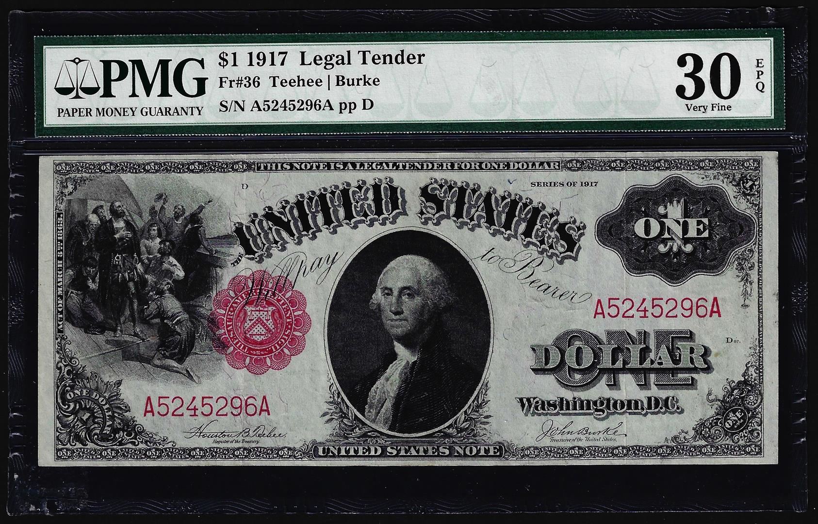 One 1917 $1 Legal Tender Note Fr.36 PMG Very Fine 30EPQ. PMG Certified.