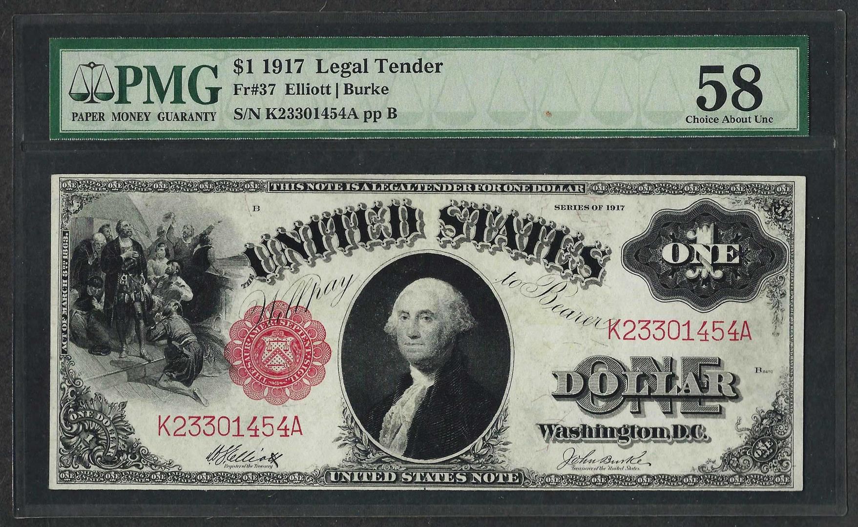 One 1917 $1 Legal Tender Note Fr.37 PMG Choice About Uncirculated 58. PMG Certified.