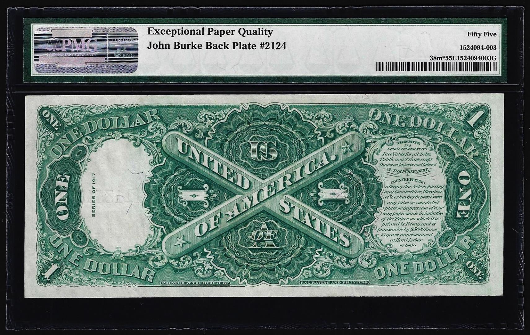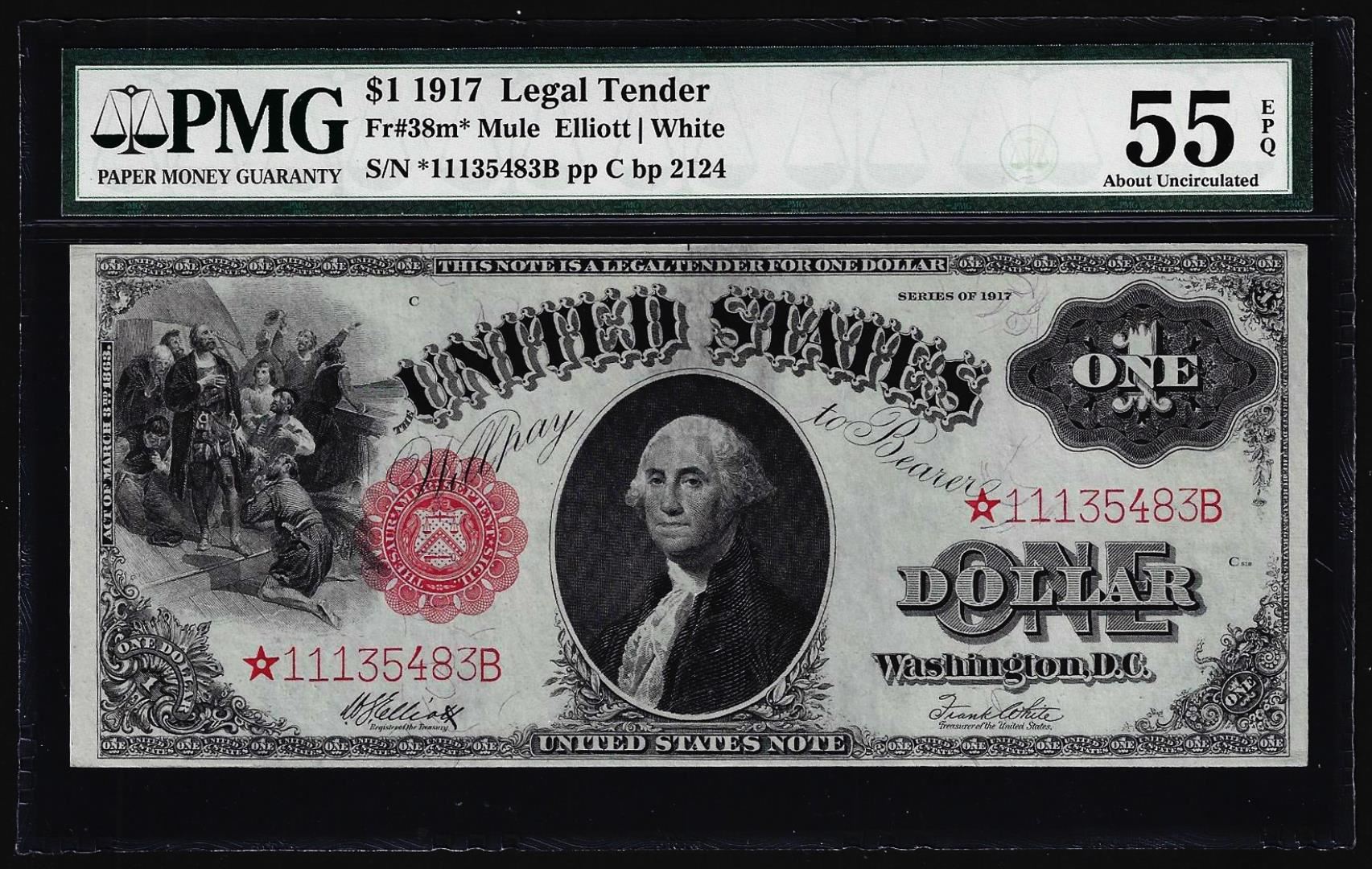One 1917 $1 Legal Tender Note Fr #38m* Mule PMG About Uncirculated 55EPQ. PMG Certified.