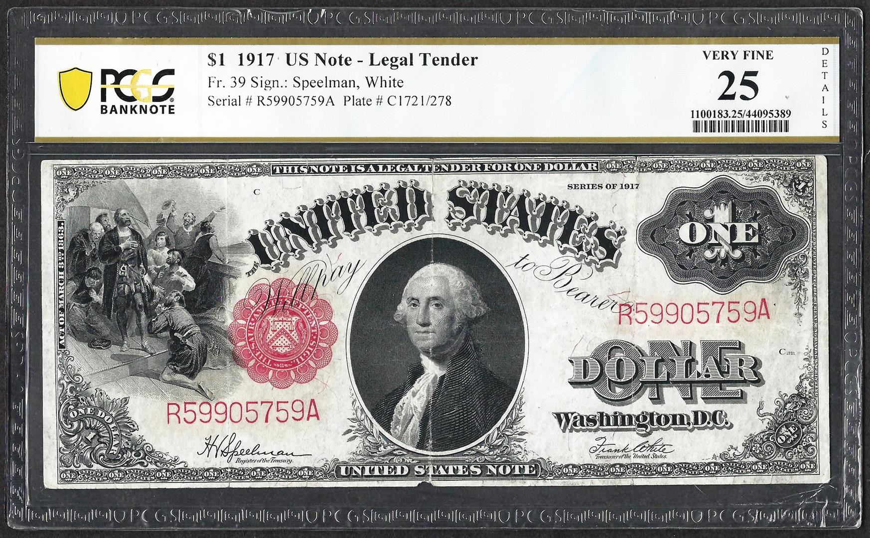 One 1917 $1 Legal Tender Note Fr. 39 PCGS Very Fine 25 Details. PCGS Graded.