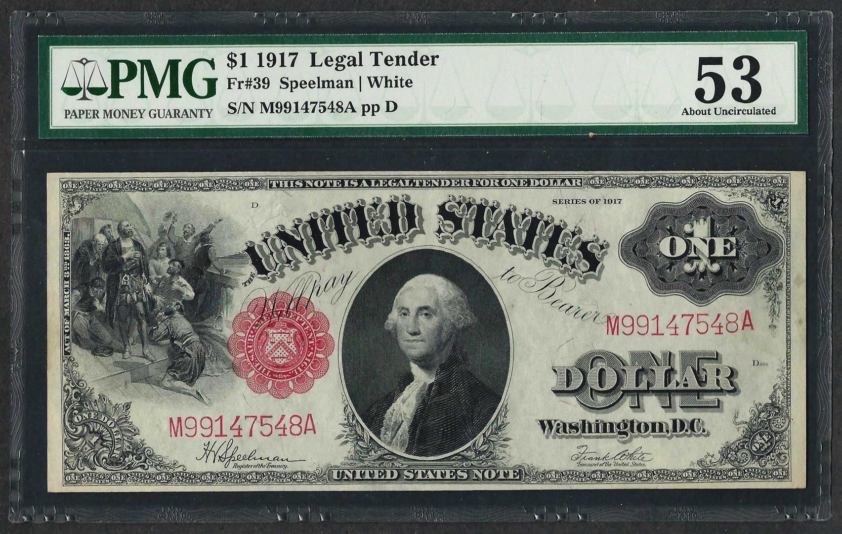 One 1917 $1 Legal Tender Note Fr.39 PMG About Uncirculated 53. PMG Certified.