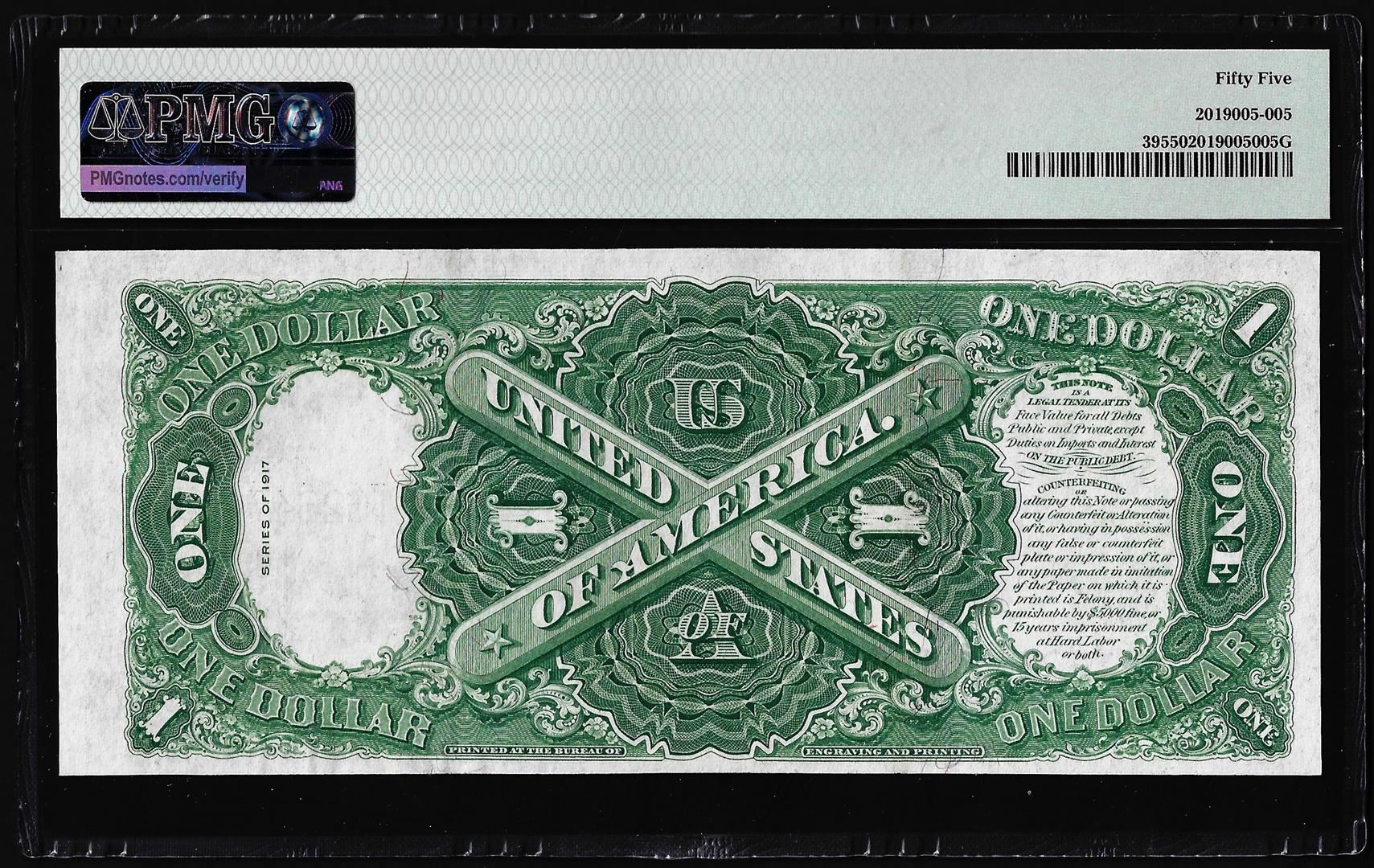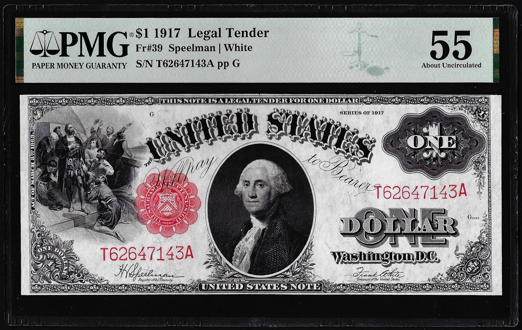 One 1917 $1 Legal Tender Note Fr.39 PMG About Uncirculated 55. PMG Certified.