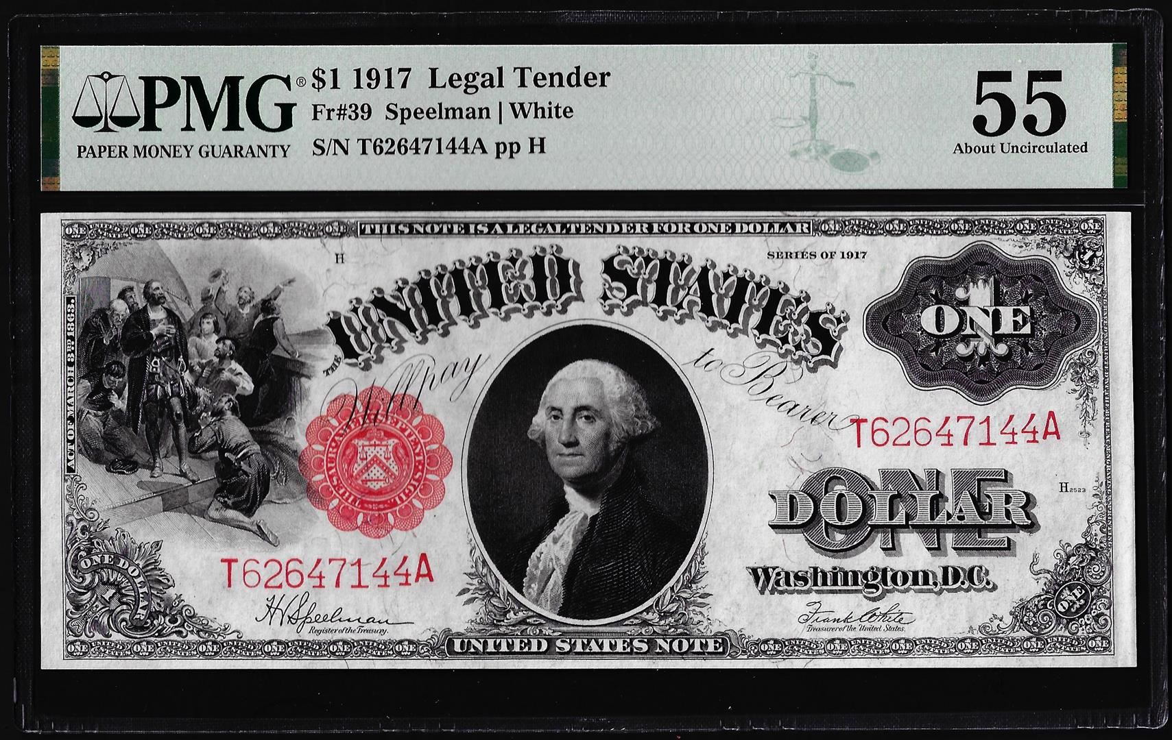 One 1917 $1 Legal Tender Note Fr.39 PMG About Uncirculated 55. PMG Certified.