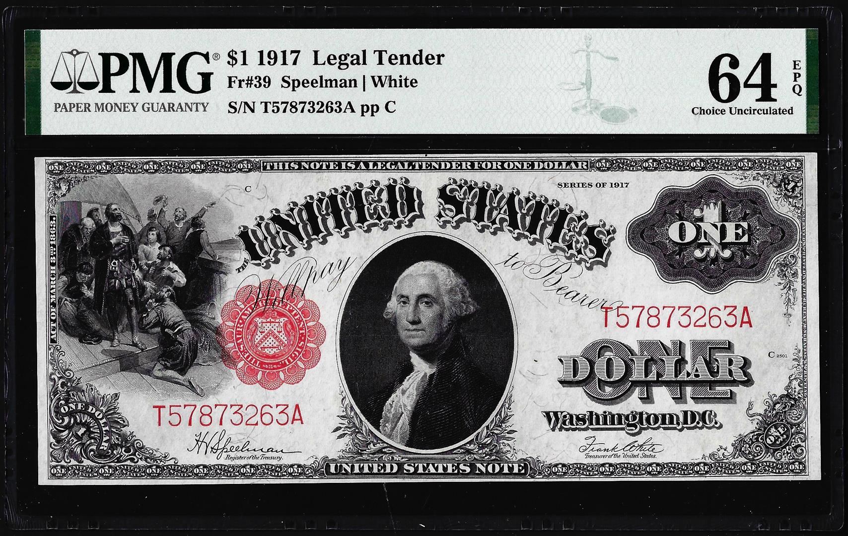 One 1917 $1 Legal Tender Note Fr.39 PMG Choice Uncirculated 64EPQ. PMG Certified.
