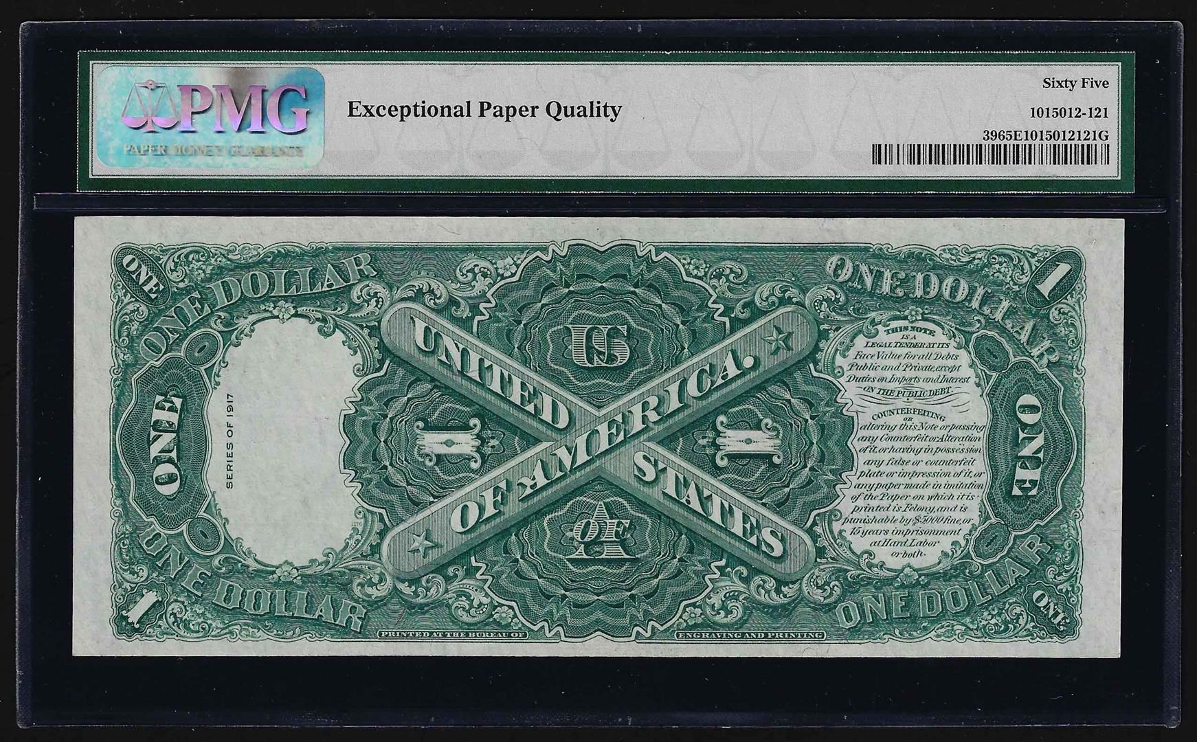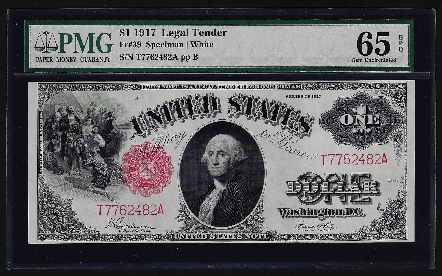One 1917 $1 Legal Tender Note Fr.39 PMG Gem Uncirculated 65EPQ. PMG Certified.