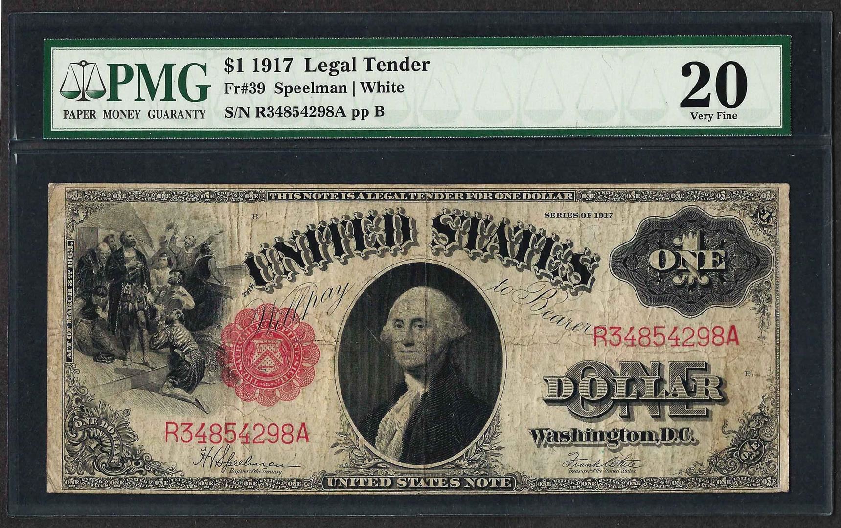 One 1917 $1 Legal Tender Note Fr.39 PMG Very Fine 20. PMG Certified.