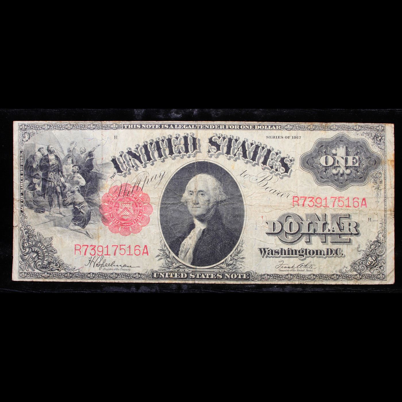 1917 $1 Legal Tender Note, George Washington Signatures of Speelman & White, FR39 Grades f+. 1917 $1 Legal Tender, Signatures of Speelman & White, FR39. This 1917 $1 note is the last large-sized legal tender bank note ever issued. It's referred to as a "Horseblanket Note," due to their large size. The obverse features Washington and a vignette of Columbus sighting America. The reverse shows a "sawhorse" design. Add in the bright red seal and serial numbers and you've got a miniature work of art.