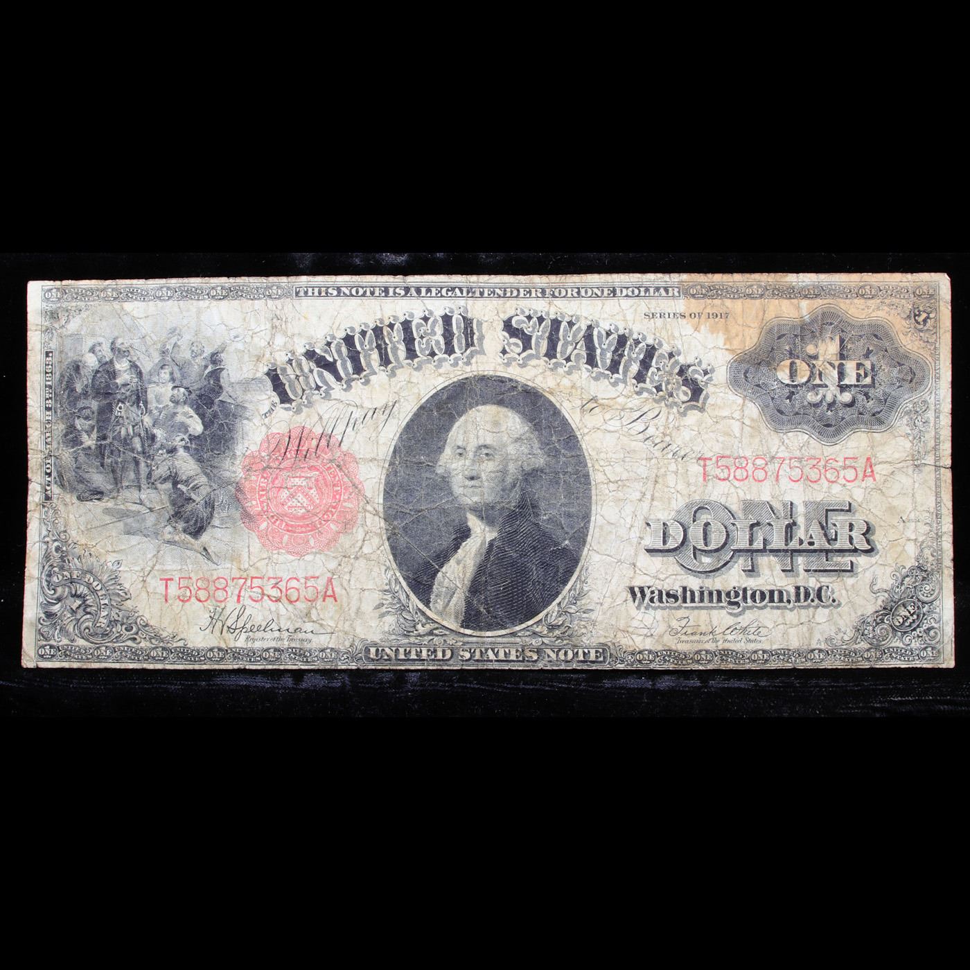 1917 $1 Legal Tender Note, George Washington Signatures of Speelman & White, FR39 Grades vg, very good. 1917 $1 Legal Tender, Signatures of Speelman & White, FR39. This 1917 $1 note is the last large-sized legal tender bank note ever issued. It's referred to as a "Horseblanket Note," due to their large size. The obverse features Washington and a vignette of Columbus sighting America. The reverse shows a "sawhorse" design. Add in the bright red seal and serial numbers and you've got a miniature work of art.