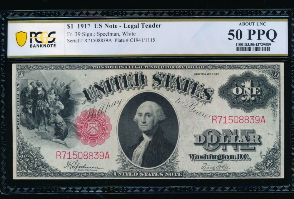 One 1917 $1 Legal Tender Note PCGS 50PPQ.