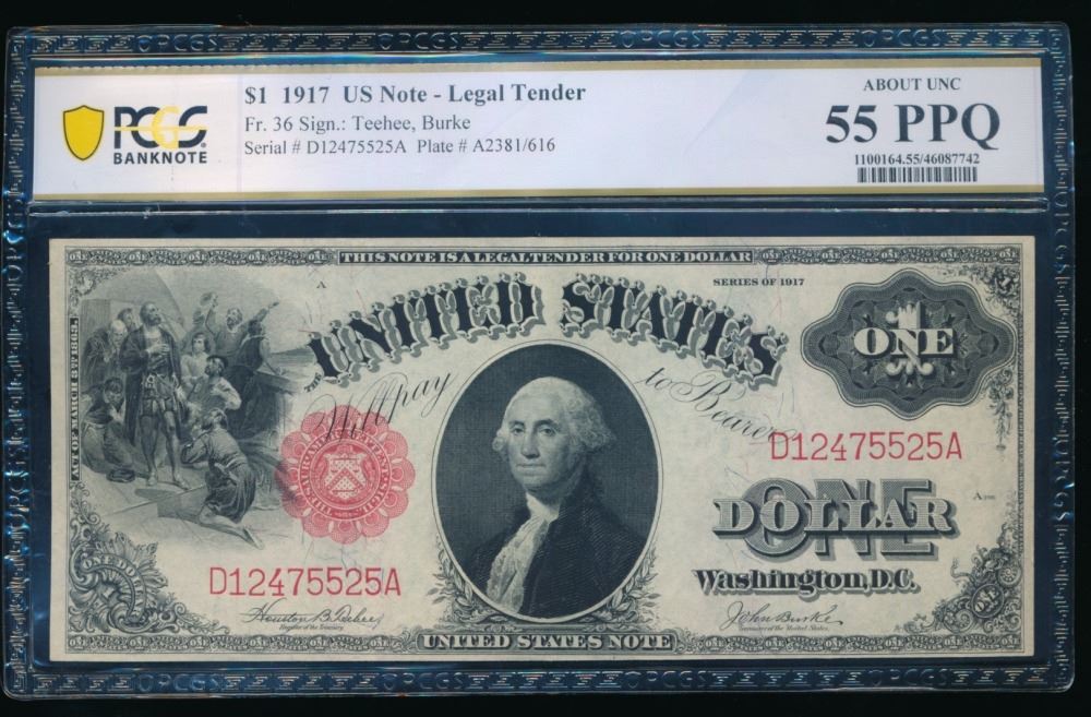 One 1917 $1 Legal Tender Note PCGS 55PPQ.