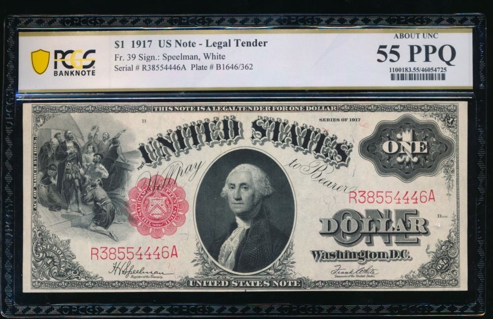 One 1917 $1 Legal Tender Note PCGS 55PPQ.