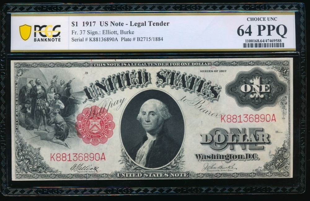 One 1917 $1 Legal Tender Note PCGS 64PPQ.