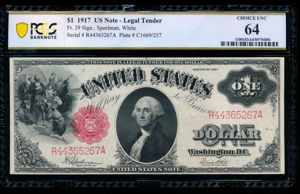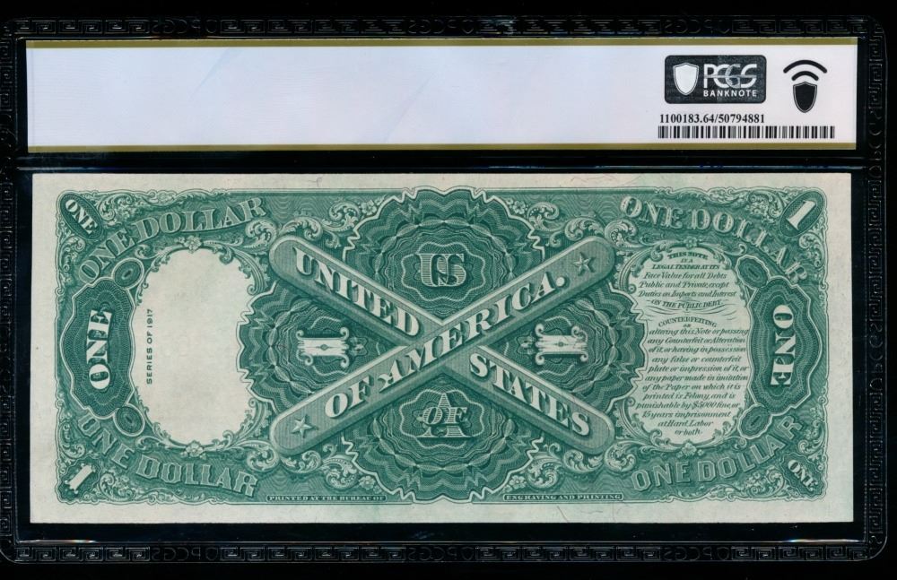 One 1917 $1 Legal Tender Note PCGS 64.