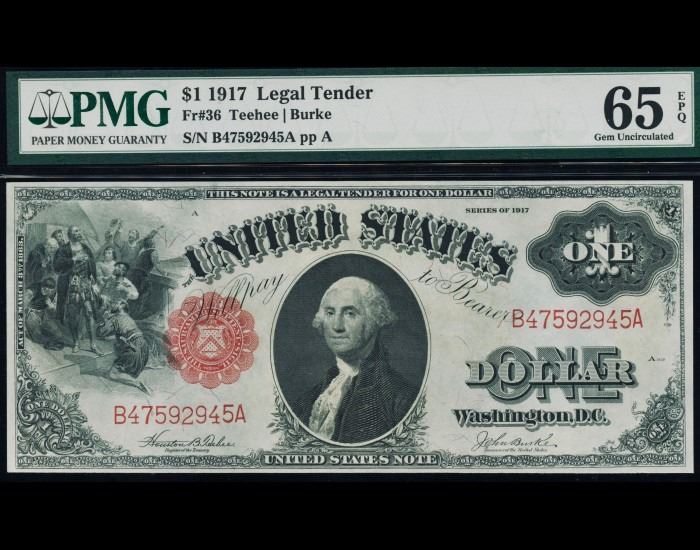 One 1917 $1 Legal Tender Note PMG 65EPQ.