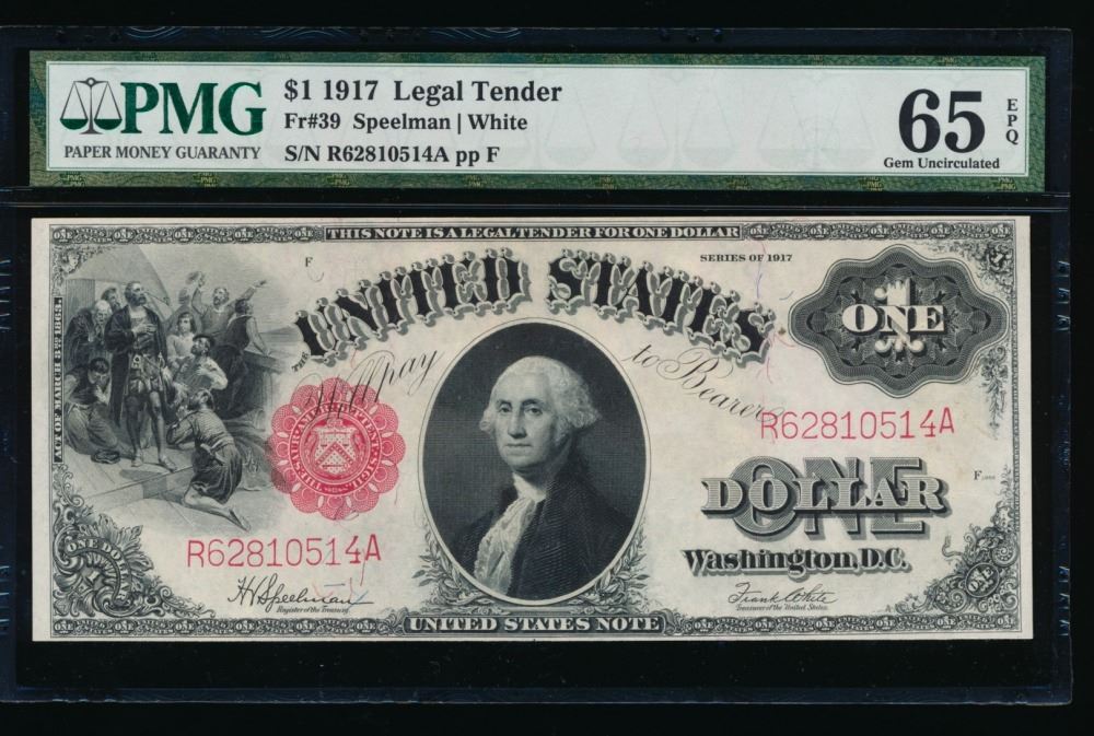 One 1917 $1 Legal Tender Note PMG 65EPQ.