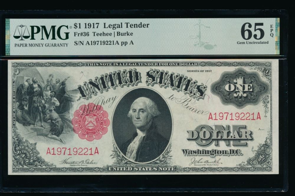 One 1917 $1 Legal Tender Note PMG 65EPQ.