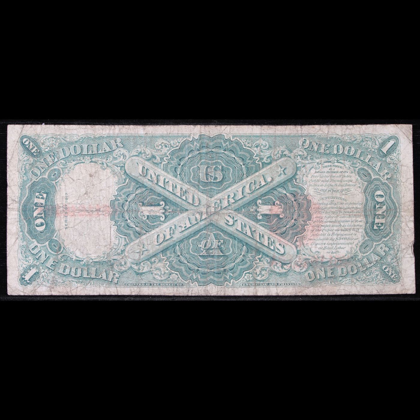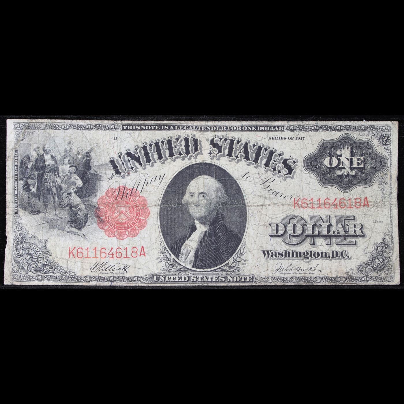 1917 $1 Legal Tender, Signatures of Elliott & Burke, FR37 Grades f+. This 1917 $1 note is the last large-sized legal tender bank note ever issued. It's referred to as a "Horseblanket Note," due to their large size. The obverse features Washington and a vignette of Columbus sighting America. The reverse shows a "sawhorse" design. Add in the bright red seal and serial numbers and you've got a miniature work of art.