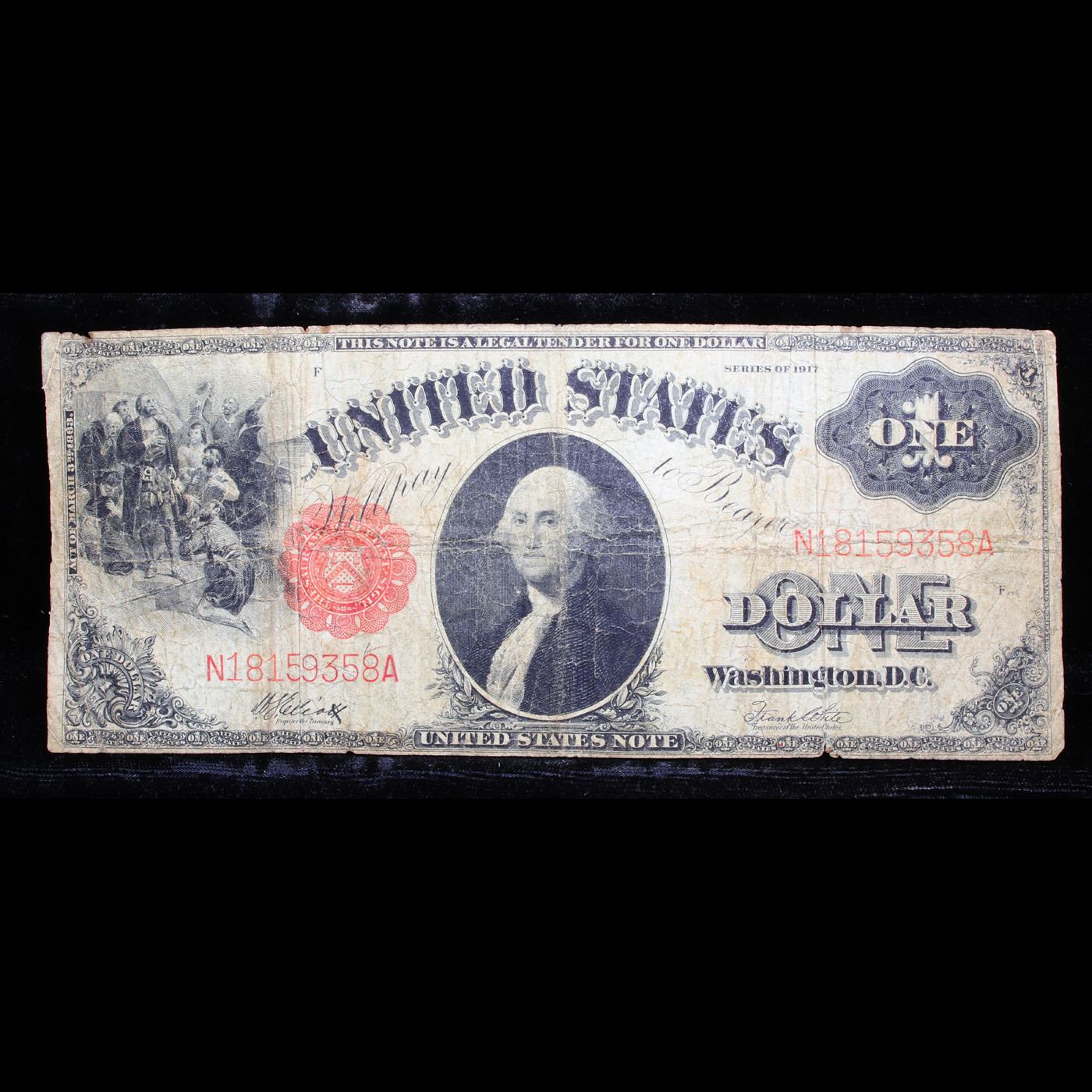 1917 $1 Legal Tender, Signatures of Elliott & White, FR-38 Grades f, fine. 1917 $1 Legal Tender, Signatures of Speelman & White, FR-38. This 1917 $1 note is the last large-sized legal tender bank note ever issued. It's referred to as a "Horseblanket Note," due to their large size. The obverse features Washington and a vignette of Columbus sighting America. The reverse shows a "sawhorse" design. Add in the bright red seal and serial numbers and you've got a miniature work of art.