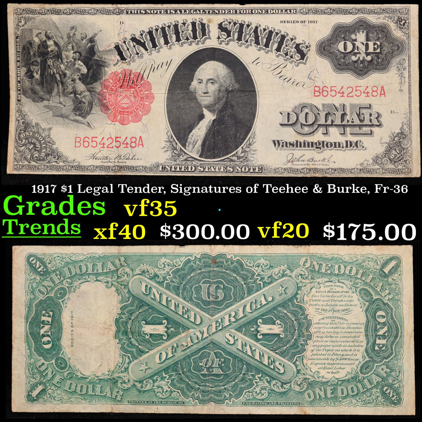1917 $1 Legal Tender, Signatures of Teehee & Burke, Fr-36 Grades vf++