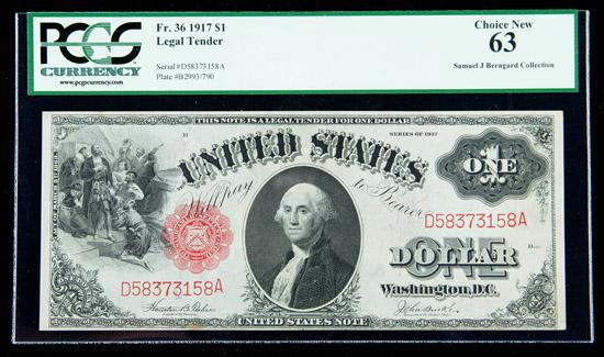 1917, $1 United States Note. PCGS Choice New 63. . Fr-36. A lovely Choice example of the popular "Sawbuck" design.