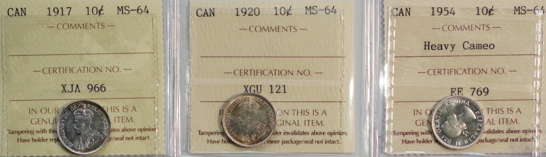 1917 10¢, 1920, and 1954 Heavy Cameo all ICCS Choice Mint State-64, lot of 3 coins.