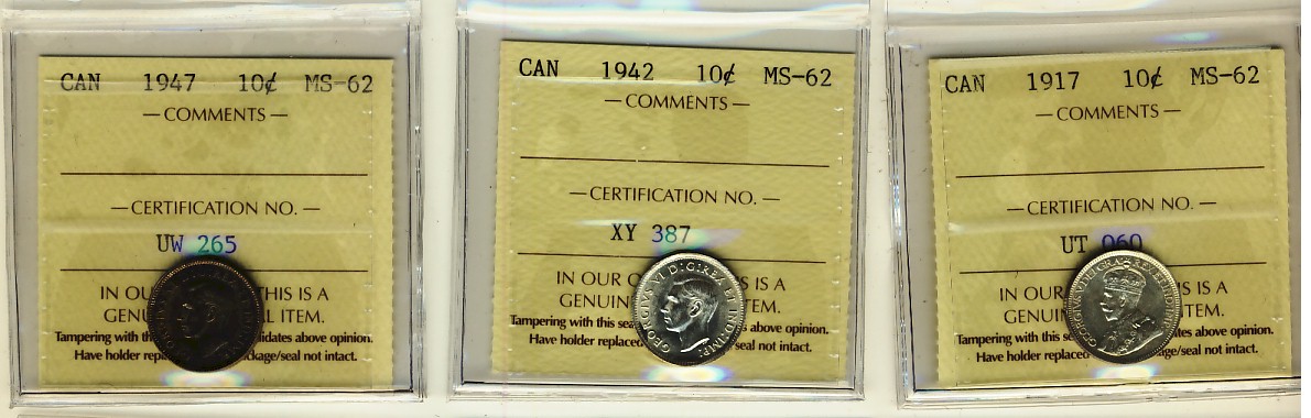1917 10¢, 1942 & 1947 ICCS MS62. Lot of 2 coins.