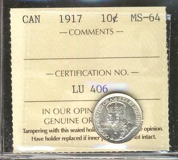 1917 10¢ ICCS MS64, brilliant and lustrous