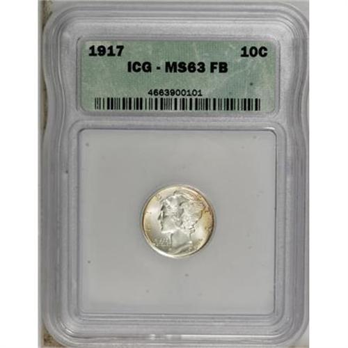 <B>1917 10C MS63 Full Bands ICG.</B></I> NGC Census: (73/313). PCGS Population (177/511). Mintage: 55,230,000. Numismedia Wsl. Price for NGC/PCGS coin in MS63: $60. (#4911)<BR><BR><B>Coin Engraver:</B> Adolph A. Weinman<BR><BR><b>Shipping:</b> Coins & Currency (<a target="_blank" href="http://www.heritageauctions.com/common/shipping.php">view shipping information</a>)