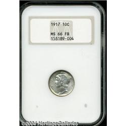 <B>1917<10C> MS66 Full Bands NGC.</B></I> A boldly struck premium Gem with creamy cartwheel luster and original pearl-gray color. A few freckles of chestnut and apple-green patina grace the reverse field. Although available in Mint State, this early Philadelphia Mint issue is by no means common with such exemplary preservation. Population: 34 in 66, 6 finer (7/04).<BR><I>From The Reed Hawn Collection of Mercury Dimes.</B></I> <BR><BR><B>Important notice:</B> Heritage usually auctions material at the rate of 200-250 lots per hour. On some occasions eBay Live bid software or the Internet may not be able to keep up with the pace of the auction. We recommend placing a realistic absentee bid now as insurance to avoid disappointment. Occasionally the auctioneer may eliminate or reject an eBay Live bid, and the auctioneer may also reopen a lot after the close of the eBay live bidding (usually because we missed an audience bid), and may reject your bid even if it shows you as the winning bidder. By bidding via eBay Live, you agree that Heritage may award the lot to another bidder at its sole discretion under the circumstances described above or any other reasonable circumstances. Since eBay bids are not shown to us until we open the lot on the floor, we treat those bids just like floor bids. In most cases the floor responds before the eBay bid is presented to us, due to Internet lag time, so for consistency we have made it a policy that floor bids are always considered first over tie eBay live bids. Also please note that all Heritage lots purchased through eBay Live carry a 20% Buyer's Premium. Please make sure you read the Terms and Conditions before you bid. </span></font></tr></table></td></tr></table>