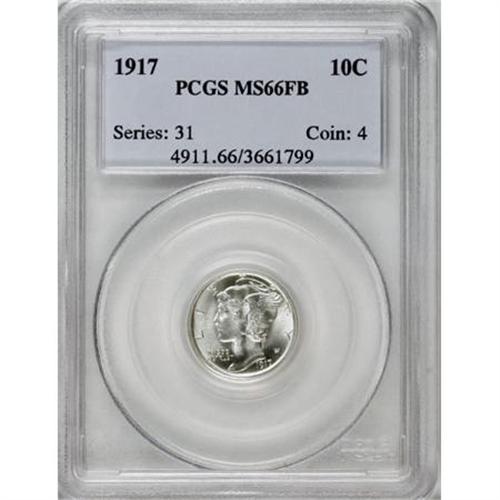 <B>1917 10C MS66 Full Bands PCGS.</B></I> A solidly struck and vibrant second-year coin with essentially untoned, slightly frosty surfaces. Excellent visual appeal. PCGS has graded 13 finer Full Bands pieces (2/08).<BR><BR><B>Coin Engraver:</B> Adolph A. Weinman<BR><BR><b>Shipping:</b> Coins & Currency (<a target="_blank" href="http://www.heritageauctions.com/common/shipping.php">view shipping information</a>)