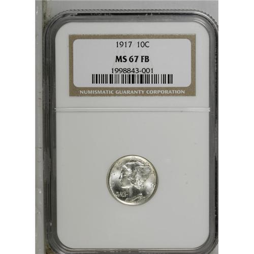 <B>1917 10C MS67 Full Bands NGC.</B></I> This Superb Gem exhibits fantastic luster and just the faintest hint of light gold color that clings to portions of the rims. The well-executed strike transcends the middle bands to include nearly all of the design elements. Only the lower parts of the 917 in the date reveal traces of softness. The surfaces are virtually flawless. Fewer than 20 1917 Mercurys have been assigned the MS67 designation with Full Bands by NGC and PCGS combined, and none finer (10/06).<BR><BR><b>Shipping:</b> Coin/Currency (<a target="_blank" href="http://www.heritageauctions.com/common/shipping.php">view shipping information</a>)