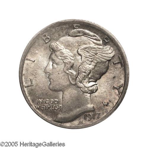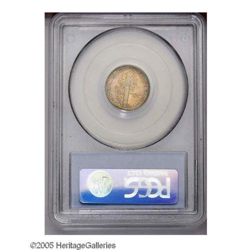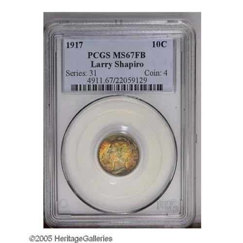 <B>1917<10C> MS67 Full Bands PCGS.</B></I> Type of 1916. The 1917 uses two distinct hub pairings. The Type of 1916 has a higher overall relief and textured fields, with subtle differences in the curls around Liberty's face and the leading edge of the wing, as well as higher relief of IN GOD WE TRUST. At first glance this coin is a virtual match to the 1916-D described previously, with deeper and more intense toning, but using a similar color palette. Apple-green highpoints yield to vivid copper, aqua, and sunset-orange borders on the obverse, while the reverse boasts more subdued silver-gray centers with blue-green iridescent rims. Well struck as expected, and lacking all but the most minor ticks. An interesting transitional issue, not to be overlooked as a premium-quality type coin. Population: 11 in 67, 0 finer (11/05).<BR><I>From The Larry Shapiro #1 All-Time Finest Mercury Dimes Full Bands Basic PCGS Registry Set.</B></I>