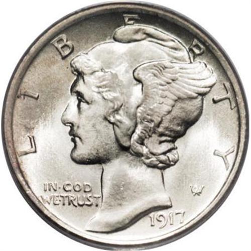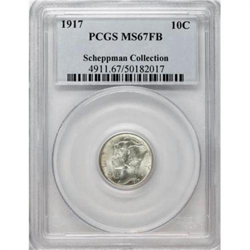 <B>1917 10C MS67 Full Bands PCGS.</B></I> By most standards, the 1917 dime is a common issue, yet examples in Superb Gem with Full Bands are rarities. This sharply struck example is tied for finest certified by PCGS (12/07). The frosty fields are essentially untoned save for whispers of rose-cream at the left margins, and the overall visual appeal is impressive. Prophetically, when Heritage last offered this piece, the cataloger wrote of this coin: "Without a doubt, it will soon claim its place in one of the best Registry Sets."<BR><I>From The Scheppman Collection, #4 PCGS Registry of Full Band Mercury Dimes.</B></I><BR><BR><B>Coin Engraver:</B> Adolph A. Weinman<BR><BR><b>Shipping:</b> Coins & Currency (<a target="_blank" href="http://www.heritageauctions.com/common/shipping.php">view shipping information</a>)