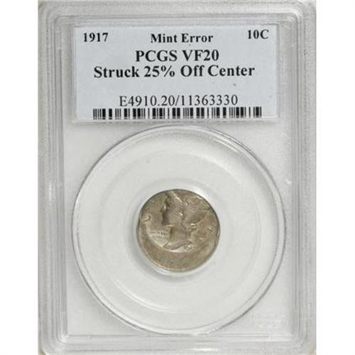 <B>1917 Mercury Dime--Struck 25% Off-Center--VF20 PCGS.</B></I> A rose-tinged silver-gray error with moderate, even wear over each side. The piece is struck off-center approximately 25% toward 1 o'clock on the obverse. Errors rarely circulate for long periods of time, which suggests that this coin was carried as a pocket-piece.<BR><BR><B>Coin Engraver:</B> Adolph A. Weinman<BR><BR><b>Shipping:</b> Coins & Currency (<a target="_blank" href="http://www.heritageauctions.com/common/shipping.php">view shipping information</a>)