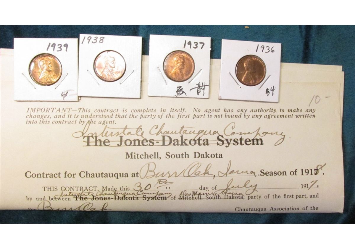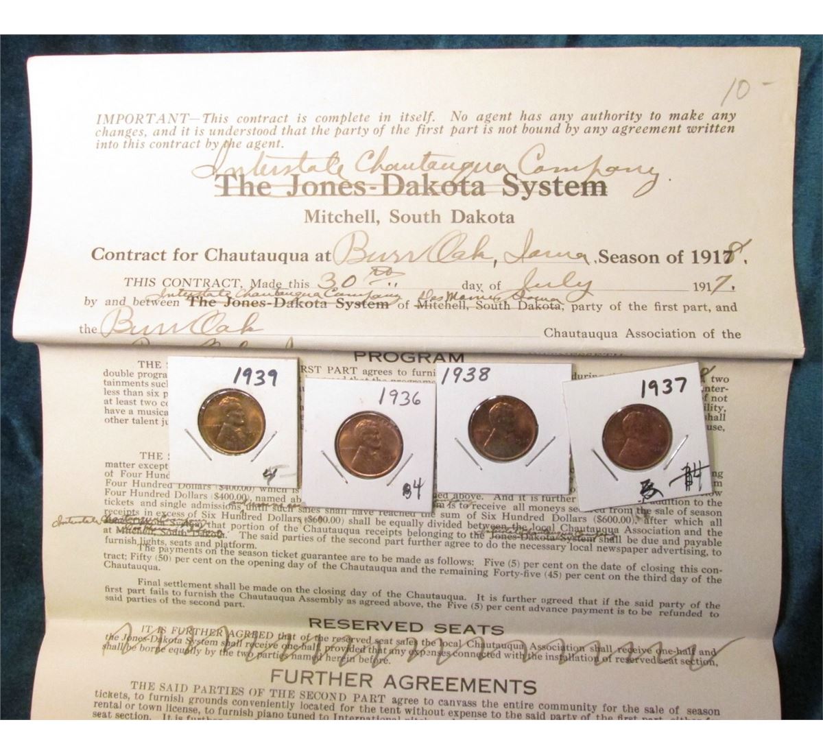 1917-18 Contract "Interstate Chautaugua Company" written over "The Janes-Dakota System" Mitchell, South Dakota contract paper & 1936P, 37P, 38P, & 39P Gem Red BU Lincoln Cents.
