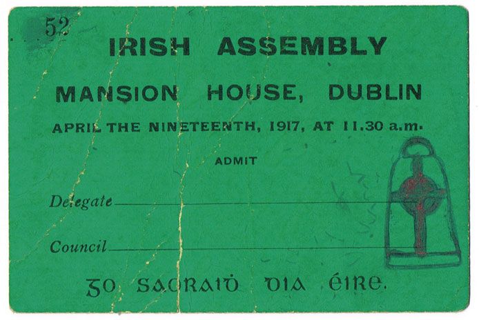 Small green ticket numbered 52 issued for admittance to the 'Irish Assembly' at the Mansion House Dublin on 19 April 1917.After Count Plunkett's victory in the North Roscommon by-election, the Count (father of the executed Joseph Mary Plunkett) decided he had a mandate to take over leadership of the independence struggle, and convened a conference in the Mansion House to discuss his plans. Sinn Fein took a different view, and the conference was packed with its supporters and ended without making any significant decisions (see TP Coogan, Michael Collins p. 66). A scarce item.