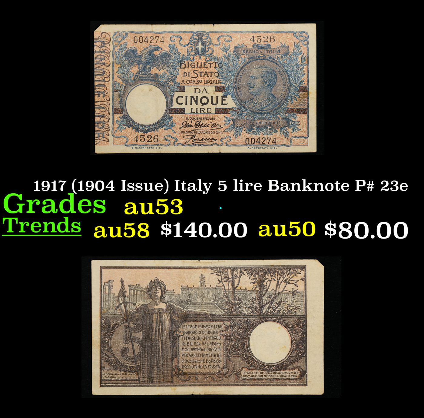 1917 (1904 Issue) Italy 5 lire Banknote P# 23e Grades Select AU.