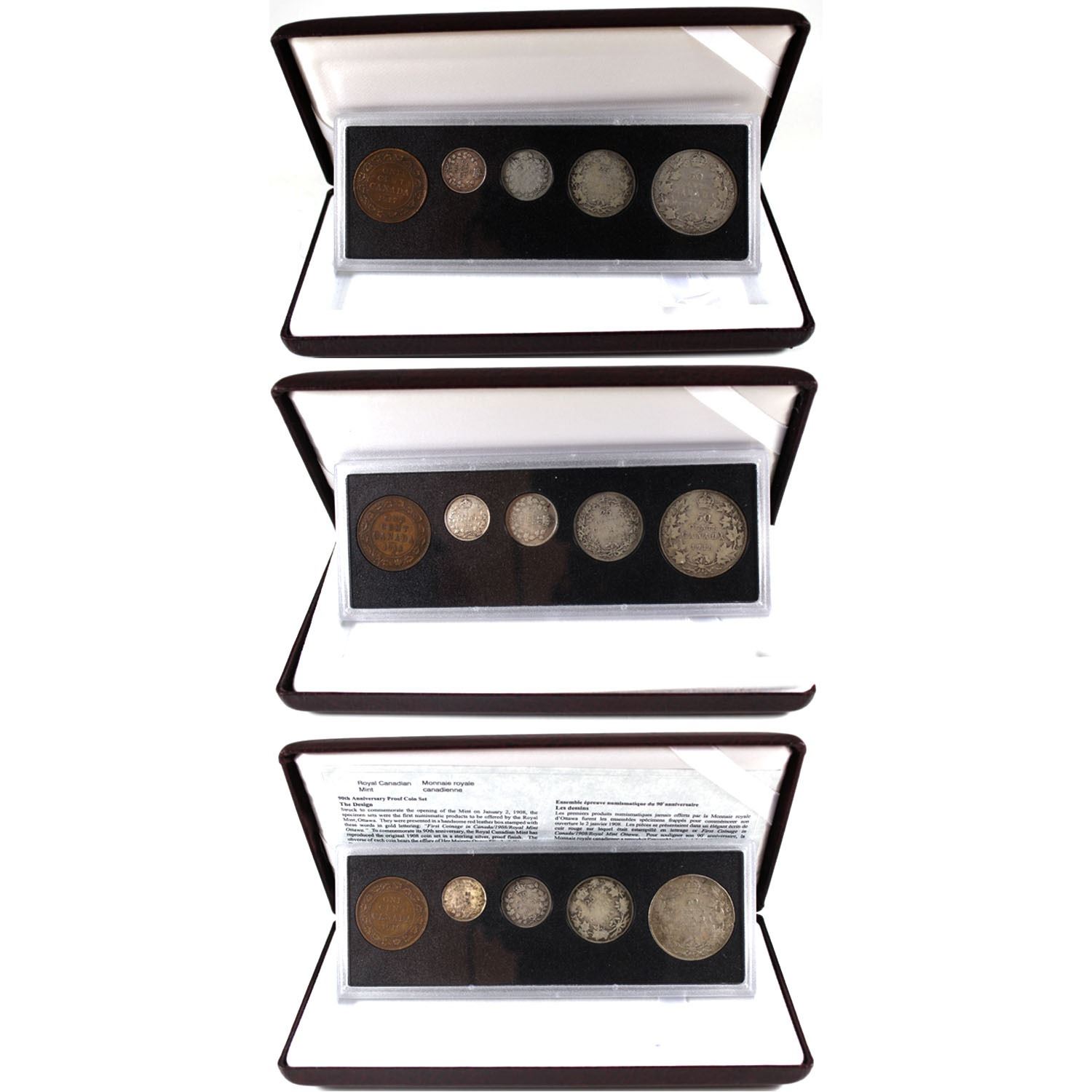1917, 1918 & 1919 Canada 5-coin (1-cent, 5-cent, 10-cent, 25-cent, 50-cent) Decimal Sets in Hard Plastic Holders and Burgundy RCM Display Boxes. 3pcs.