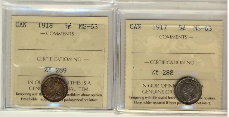 1917 & 1918 5¢ ICCS MS63. Lot of 2 coins both attractive and lustrous.