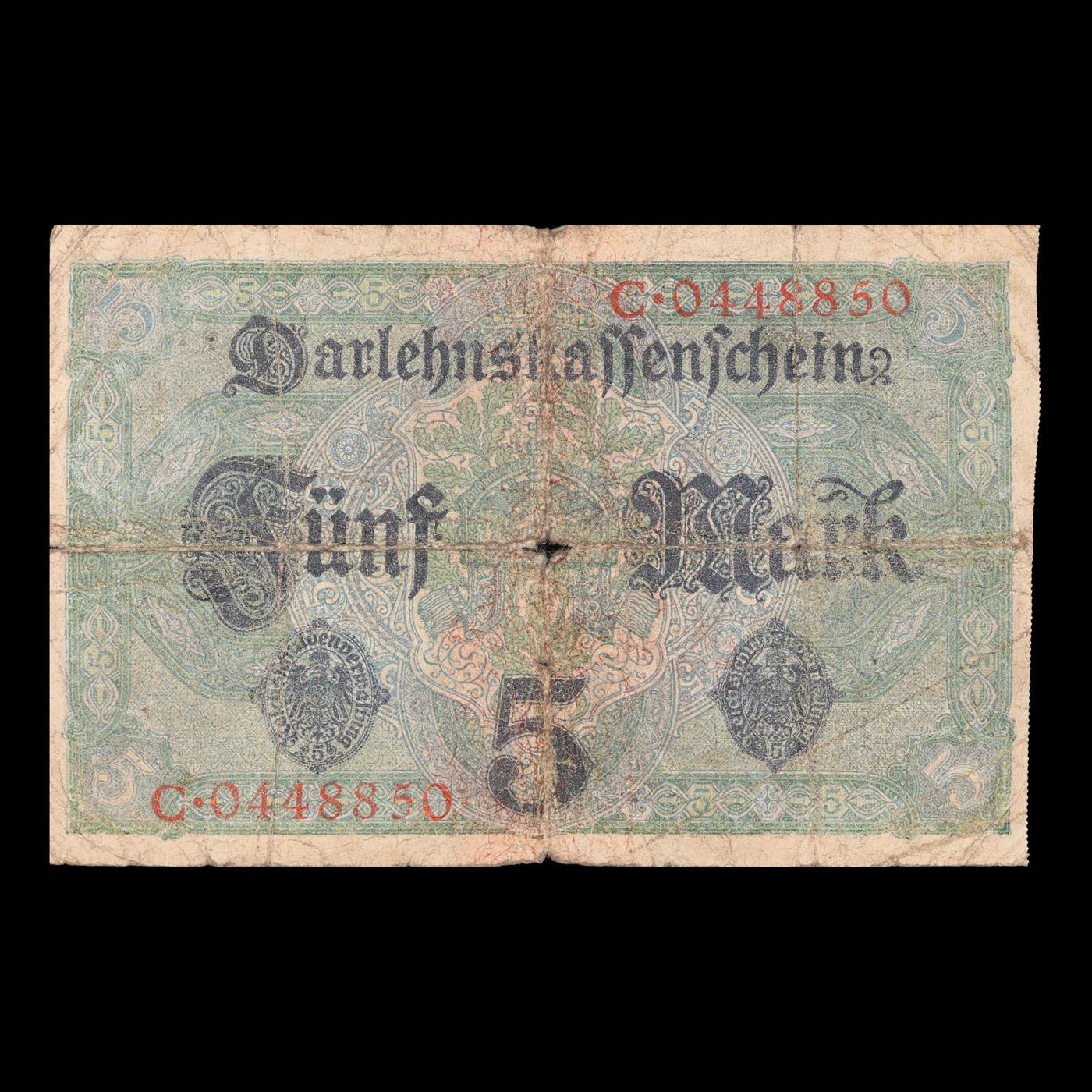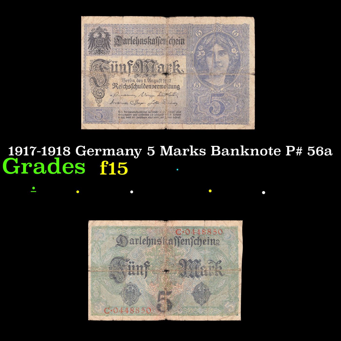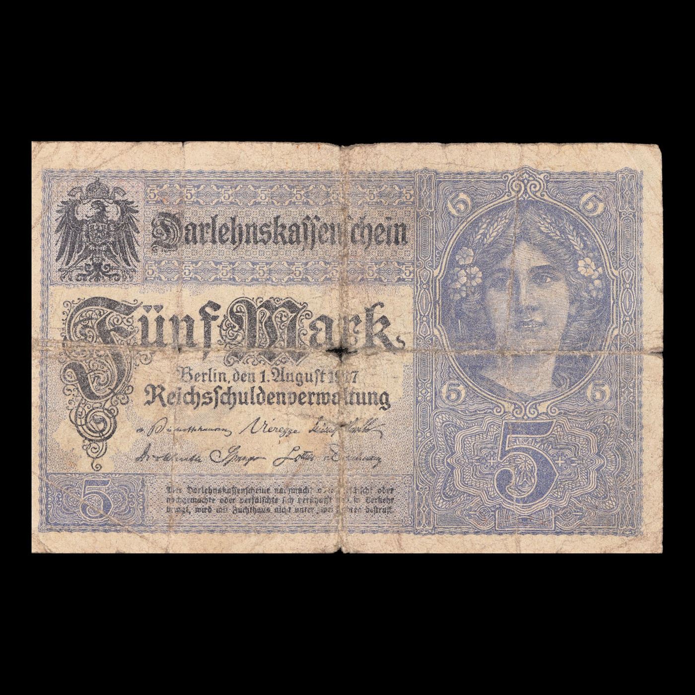1917-1918 Germany 5 Marks Banknote P# 56a Grades f+. In August 1914, Directly after the onset of WW1, the German Empire removed the gold backing of the mark and issued new currency. After the fall of the German Empire in 1918, the newly formed German Weimar Republic issued another new currency, known derisively as the "Paper Mark", which faced massive hyperinflation.